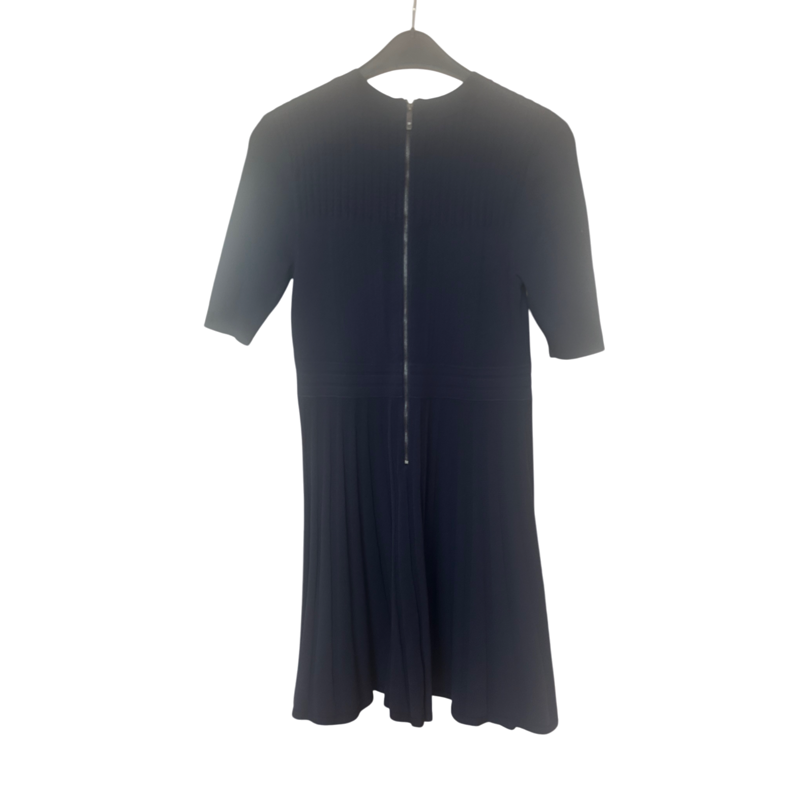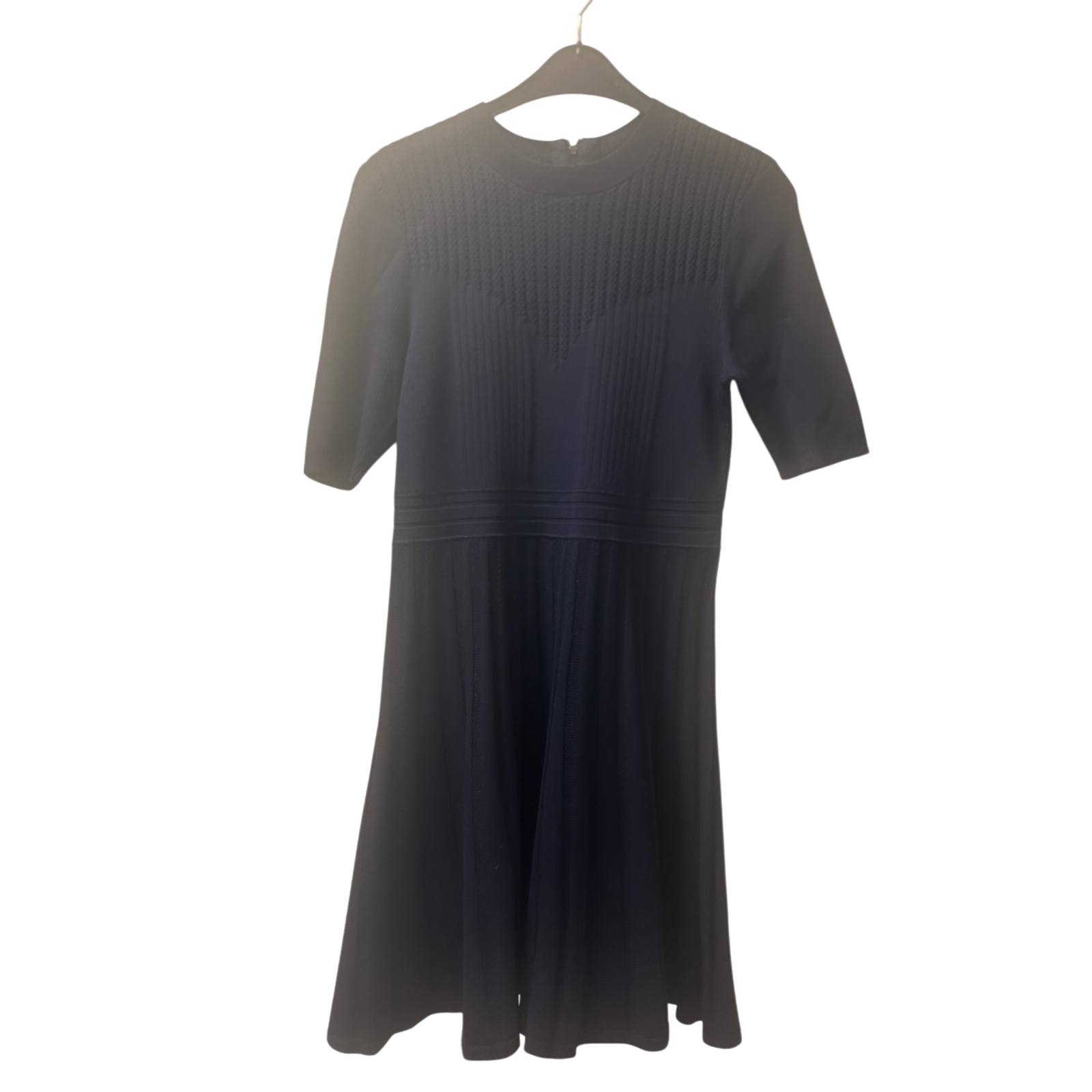 Edles Ted Baker London Kleid in dunklem Blau, Größe L (40/42). Das Kleid besticht durch seine hochwertige Verarbeitung mit strukturiertem Stoff und einem eleganten, plissierten Rockteil. Mit halblangen Ärmeln, Rundhalsausschnitt und rückseitigem Reißverschluss sorgt es für eine schmeichelhafte Silhouette. Ideal für festliche Anlässe oder das Büro.