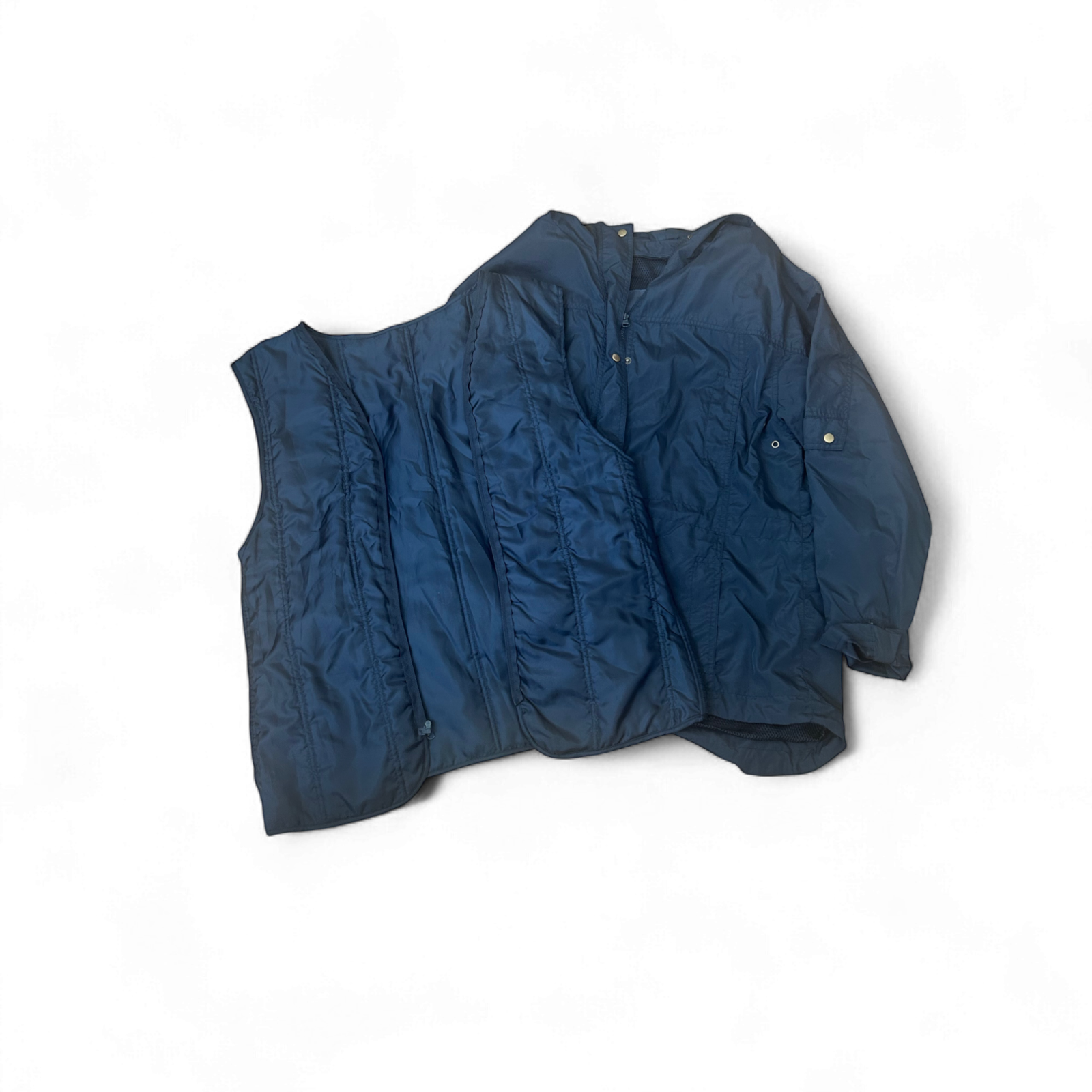 Perfekt vorbereitet bei wechselhaftem Wetter 🌦️ Diese dunkelblaue Regenjacke von TCM in Größe 40/42 überzeugt mit einem cleveren 2-in-1-System: Die gesteppte Innenweste ist herausnehmbar und kann auch separat getragen werden 💡 Die Jacke ist leicht und angenehm zu tragen, ideal für Frühling, Sommer und Herbst. Sie bietet durch die Kapuze mit Kragen, Reißverschluss und Druckknopfleiste guten Schutz vor Wind und leichtem Regen. Mit einer Brustweite von ca. 55 cm, einer Ärmellänge von 65 cm und einer Gesamtlänge von 68 cm ist sie bequem geschnitten und hat eine figurfreundliche Passform ✨ Praktische Reißverschlusstaschen und die dezente V-Steppung machen sie zum zuverlässigen Begleiter im Alltag 💼