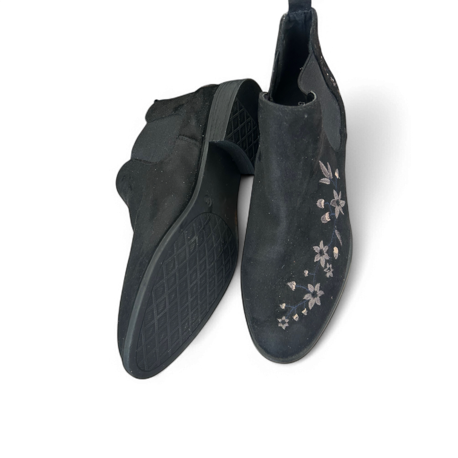 ✨ Die Graceland Stiefeletten in Größe 40 sind ein echter Hingucker! Das schwarze Obermaterial ist mit zarter Blumenstickerei verziert und verleiht jedem Outfit einen femininen Touch. Perfekt für den Alltag oder besondere Anlässe – diese Schuhe kombinieren Komfort mit stilvollem Design.