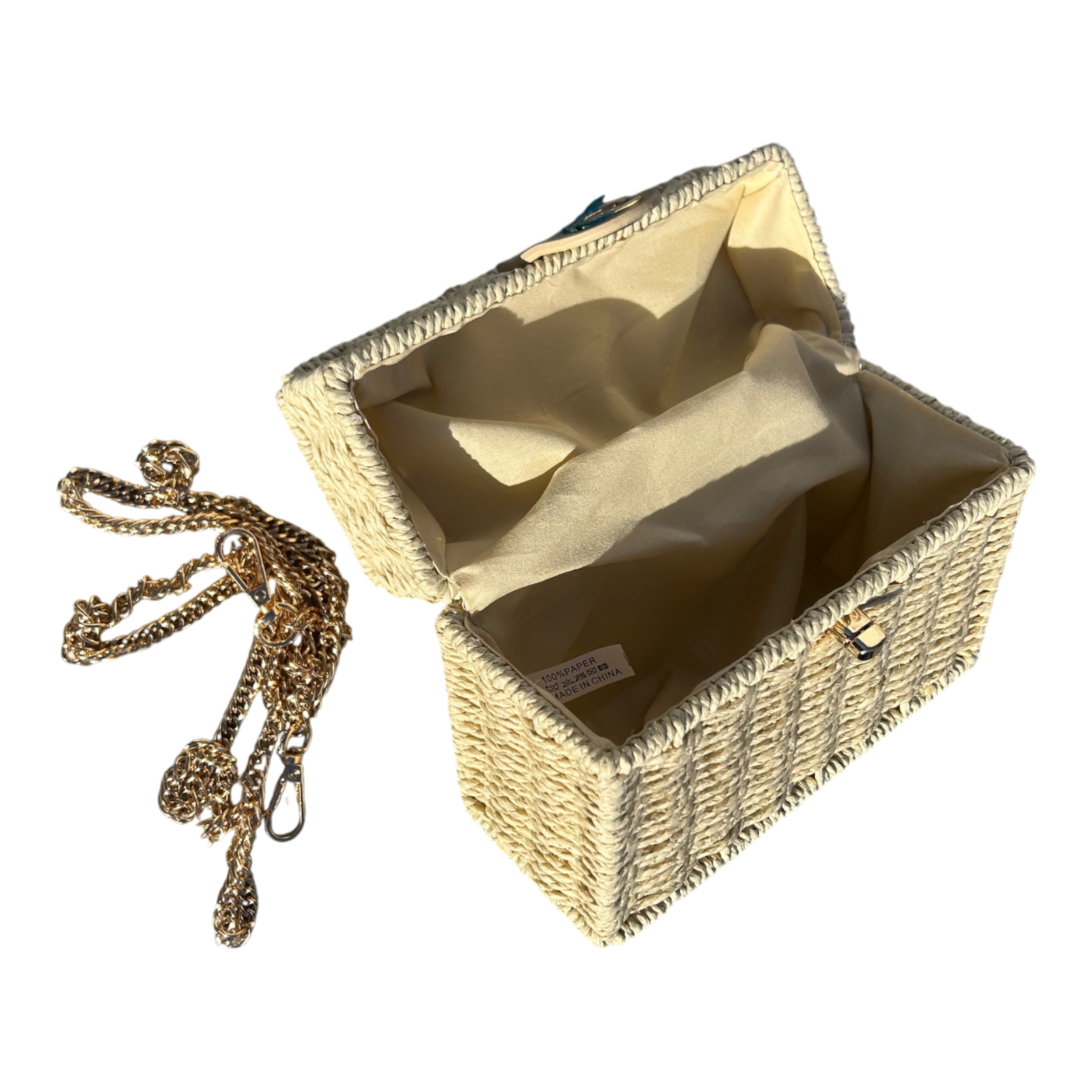 Der goldene Drehverschluss sorgt für sicheren Halt, während die abnehmbare Schulterkette mehrere Tragemöglichkeiten ermöglicht.