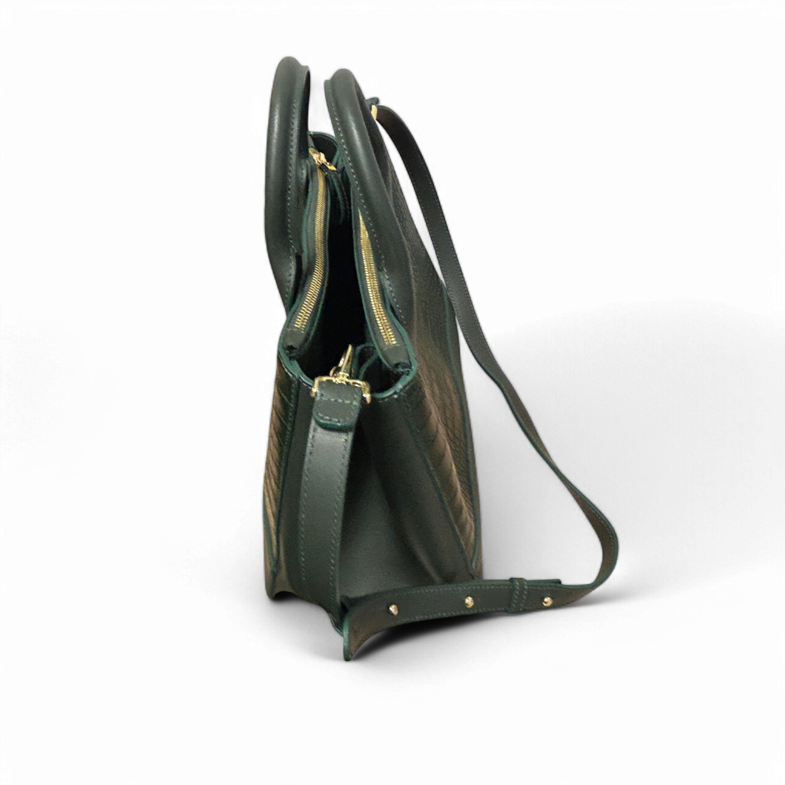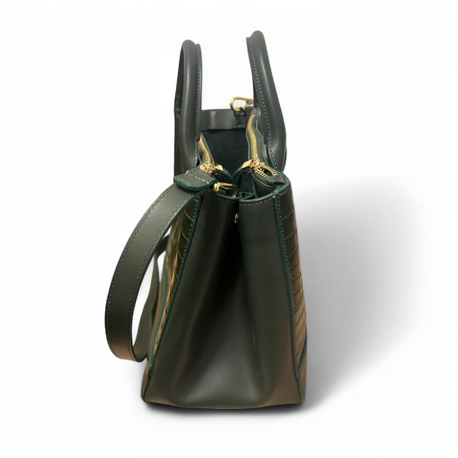 Gefertigt aus hochwertigem Echtleder in edlem Dunkelgrün mit stilvoller Croco-Prägung, wird sie durch goldfarbene Details zum zeitlosen Statement-Piece.