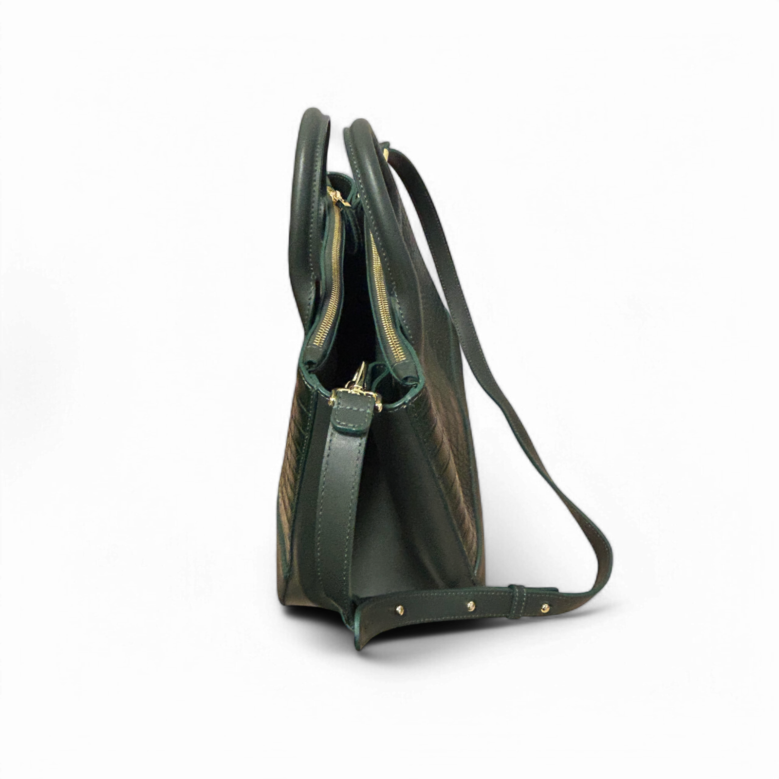 Diese elegante Designer-Handtasche von Teddy Blake New York überzeugt durch zeitloses Design und hochwertige italienische Lederverarbeitung. Gefertigt aus echtem, tief dunkelgrünem Rindsleder mit edler Croco-Prägung wirkt die Tasche luxuriös und zugleich modern.