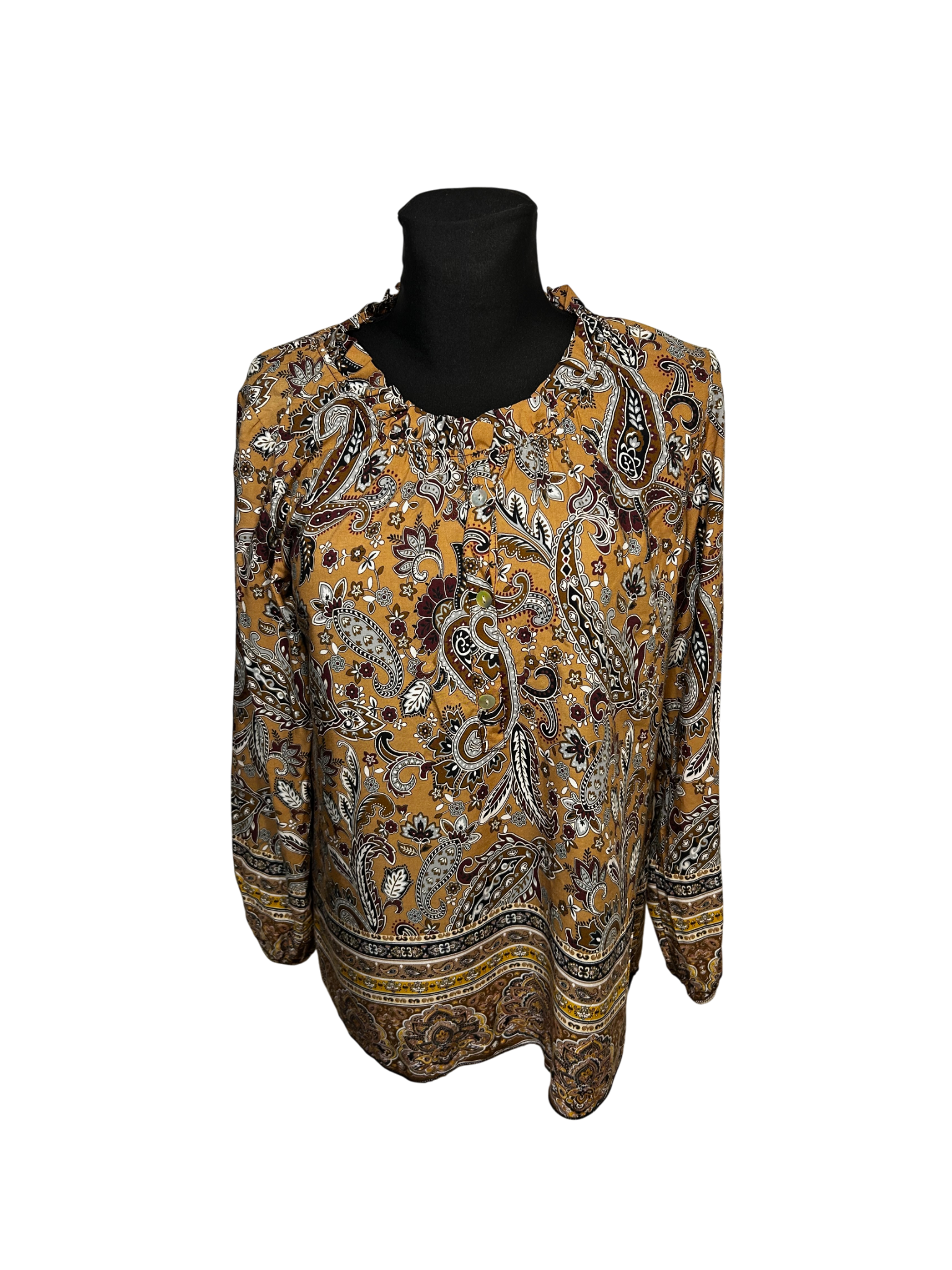 Eine wunderschöne Bluse von 3 Stars in Größe 40, die mit ihrem italienischen Boho-Charme sofort ins Auge fällt. Das weiche Material aus 100% Viskose trägt sich angenehm und fällt locker am Körper. Die Brustweite beträgt 51 cm, die Länge 68 cm und die Ärmellänge 60 cm. Das detailreiche Paisley-Muster in warmen Gelb- und Brauntönen macht die Bluse zu einem vielseitigen Lieblingsstück für Freizeit oder Büro. 🌼 Ein stilvolles It-Piece, das toll zu Jeans, Stoffhosen oder Röcken kombiniert werden kann.