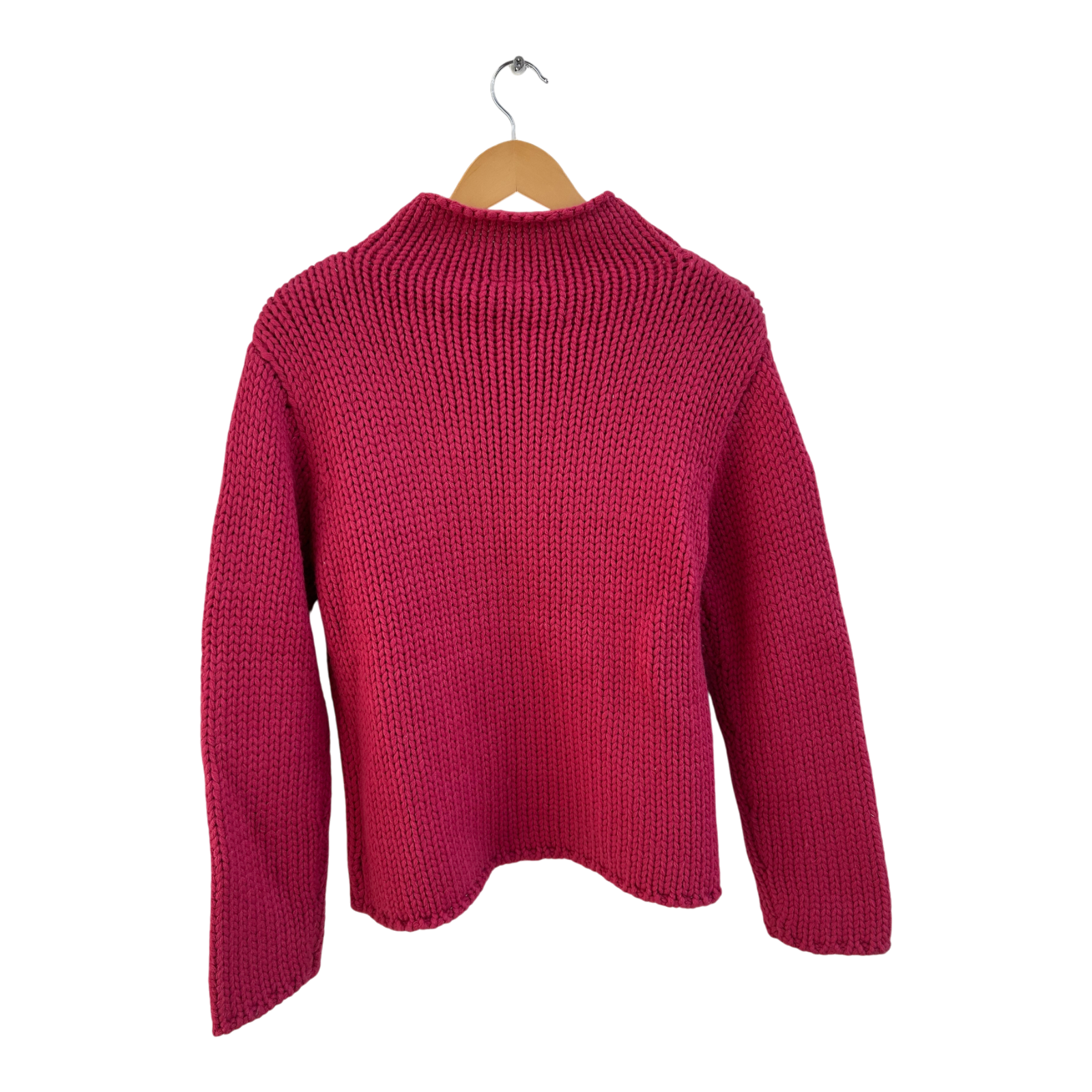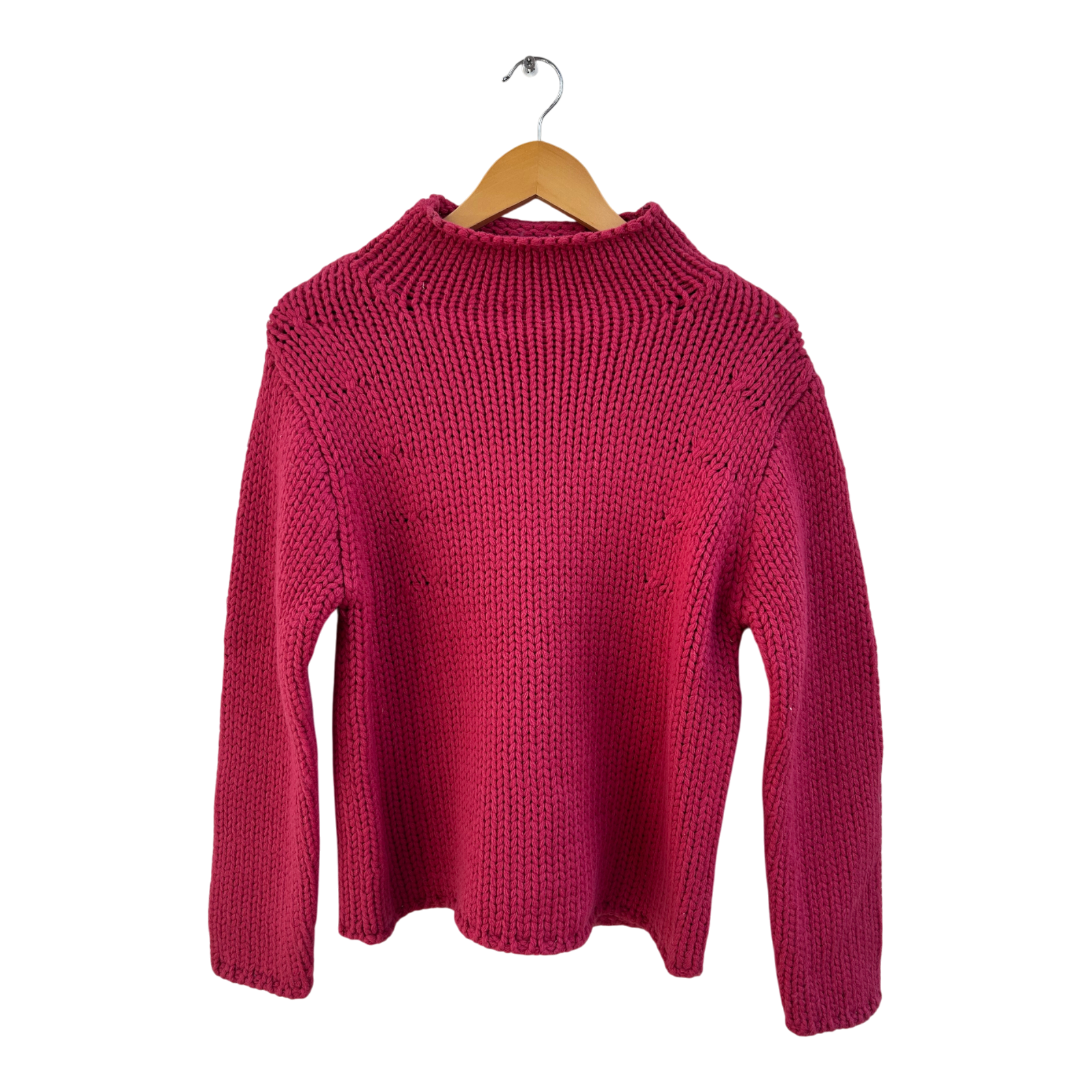 Mit seinem klassischen Rollkragen und der leuchtenden Pink-Farbe ist er ein stilvoller Begleiter für kühle Tage – gemütlich und trotzdem elegant.