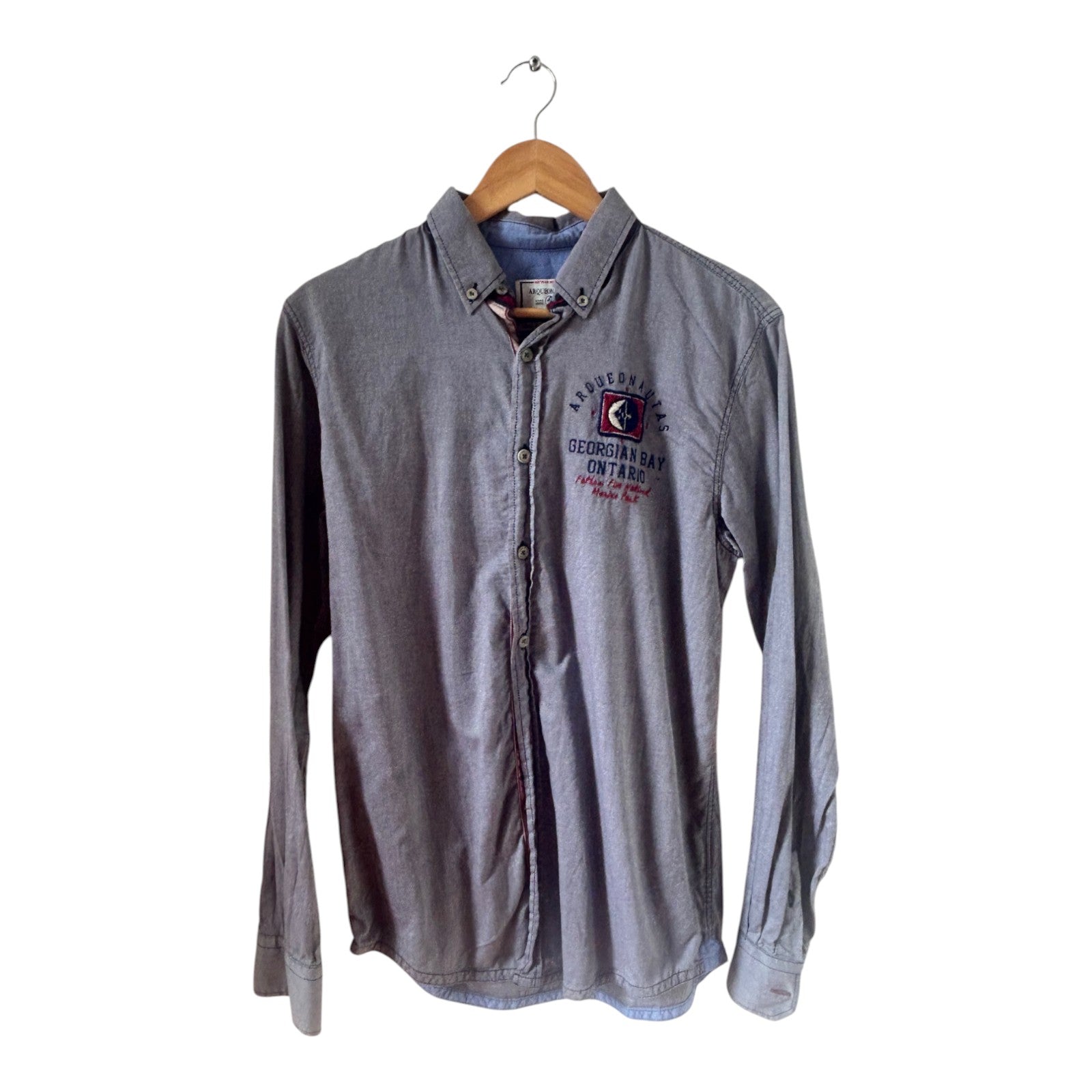 Charakterstarkes Hemd von Arqueonautas in Größe S. Das graue Hemd überzeugt mit aufwendigen Details: vorne eine Stickerei, hinten ein großes Patch mit maritimen Motiven und Schriftzug. Gefertigt aus 100 % Baumwolle bietet es angenehmen Tragekomfort. Die Brustweite beträgt 50 cm, die Länge 68 cm und die Ärmellänge 68 cm. Mit Button-Down-Kragen und sportlich-elegantem Stil ist es ideal für Freizeit und Casual Outfits. 🌊👔