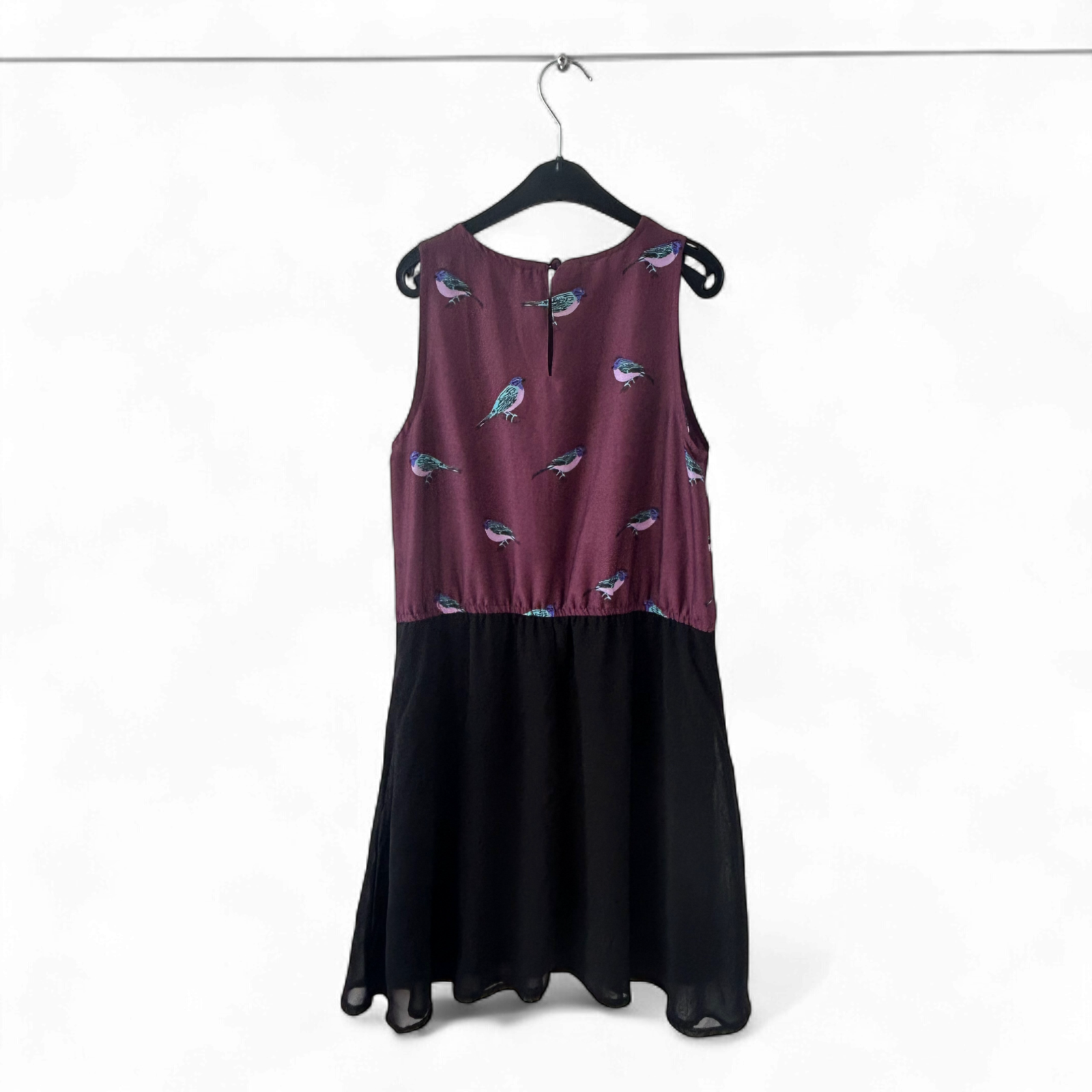 Verspieltes Kleid von Atmosphere in Größe 34 mit zauberhaftem Vogel-Print auf bordeauxrotem Oberteil und fließendem schwarzem Rock. Das ärmellose Modell ist leicht gefüttert und ideal für warme Tage oder Lagenlooks mit Cardigan. Durch die elastische Taille sitzt es angenehm und locker 🖤