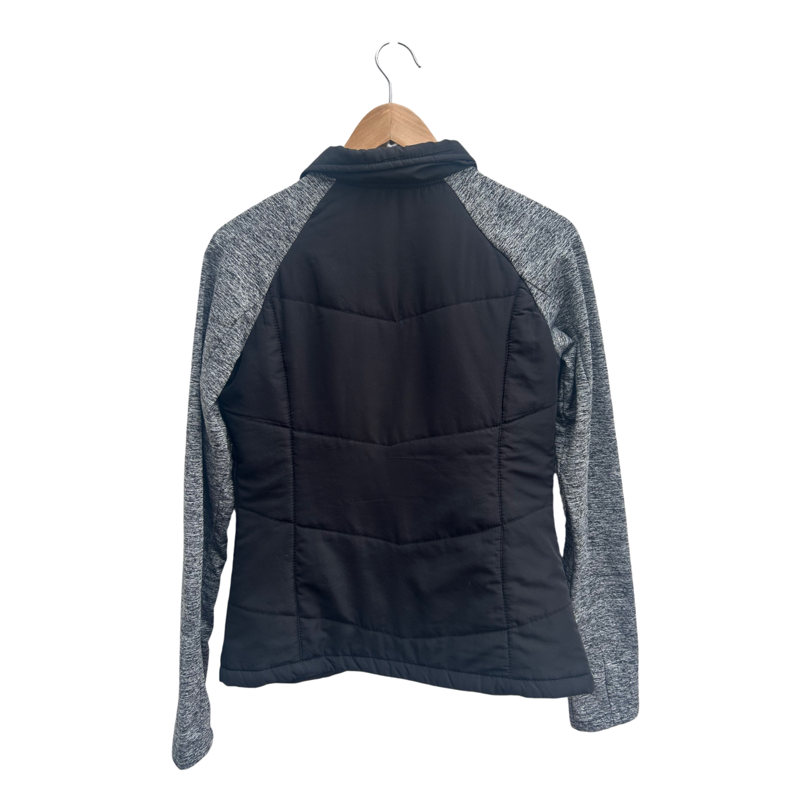 Diese sportlich-moderne Damenjacke von Atmosphere in Größe 38 ist ideal für Freizeit, Training oder kühle Tage. Sie besteht aus 100 % Polyester, ist leicht wattiert und angenehm zu tragen. Die Kombination aus schwarzer Vorderseite und grauen melierten Ärmeln sorgt für einen modernen Look. Die Brustweite beträgt ca. 47 cm, die Länge ca. 61 cm und die Ärmellänge ca. 68 cm. Besonders praktisch: Am Ärmelabschluss befindet sich eine Öffnung für den Finger – perfekt beim Joggen oder Workout. Zustand: sehr gut.