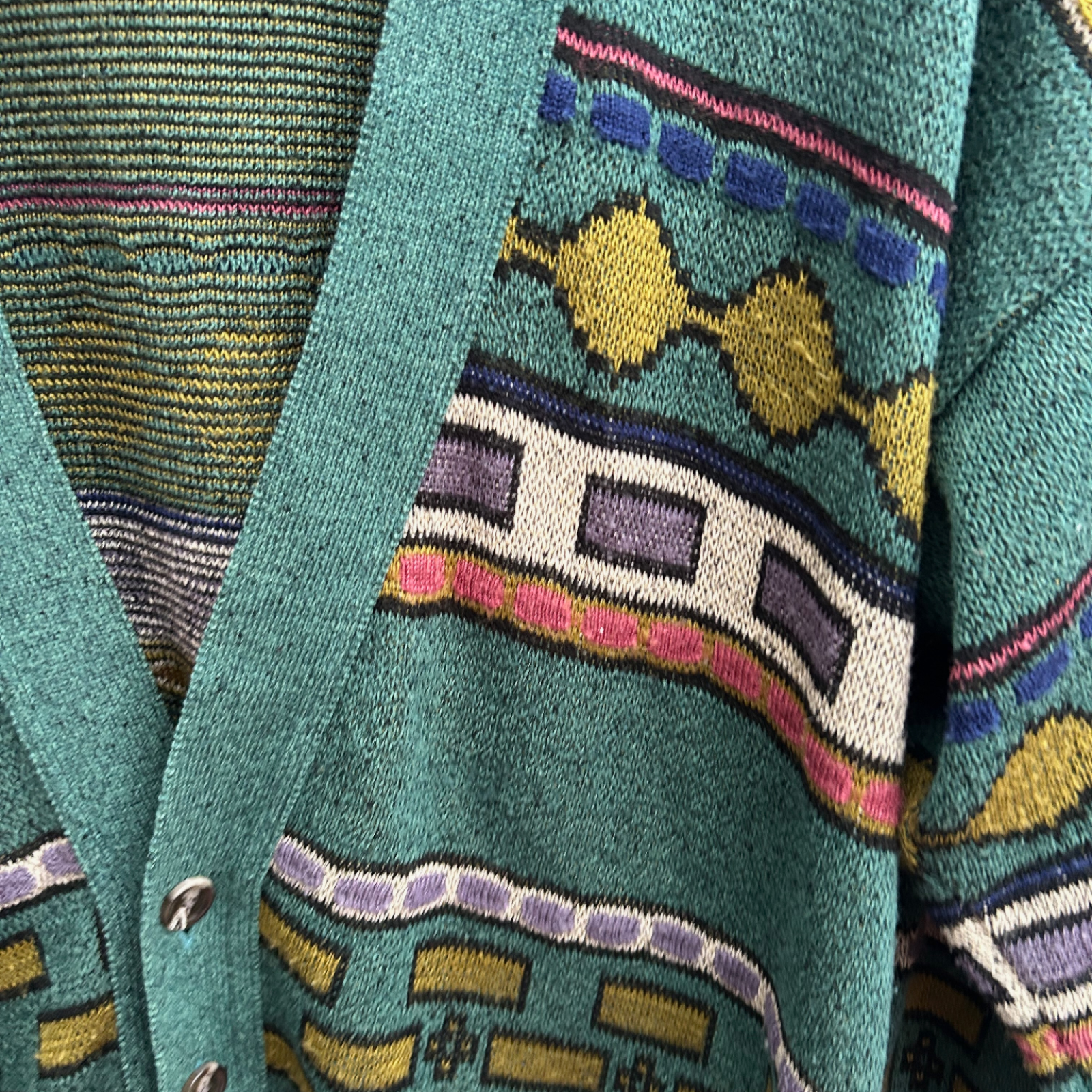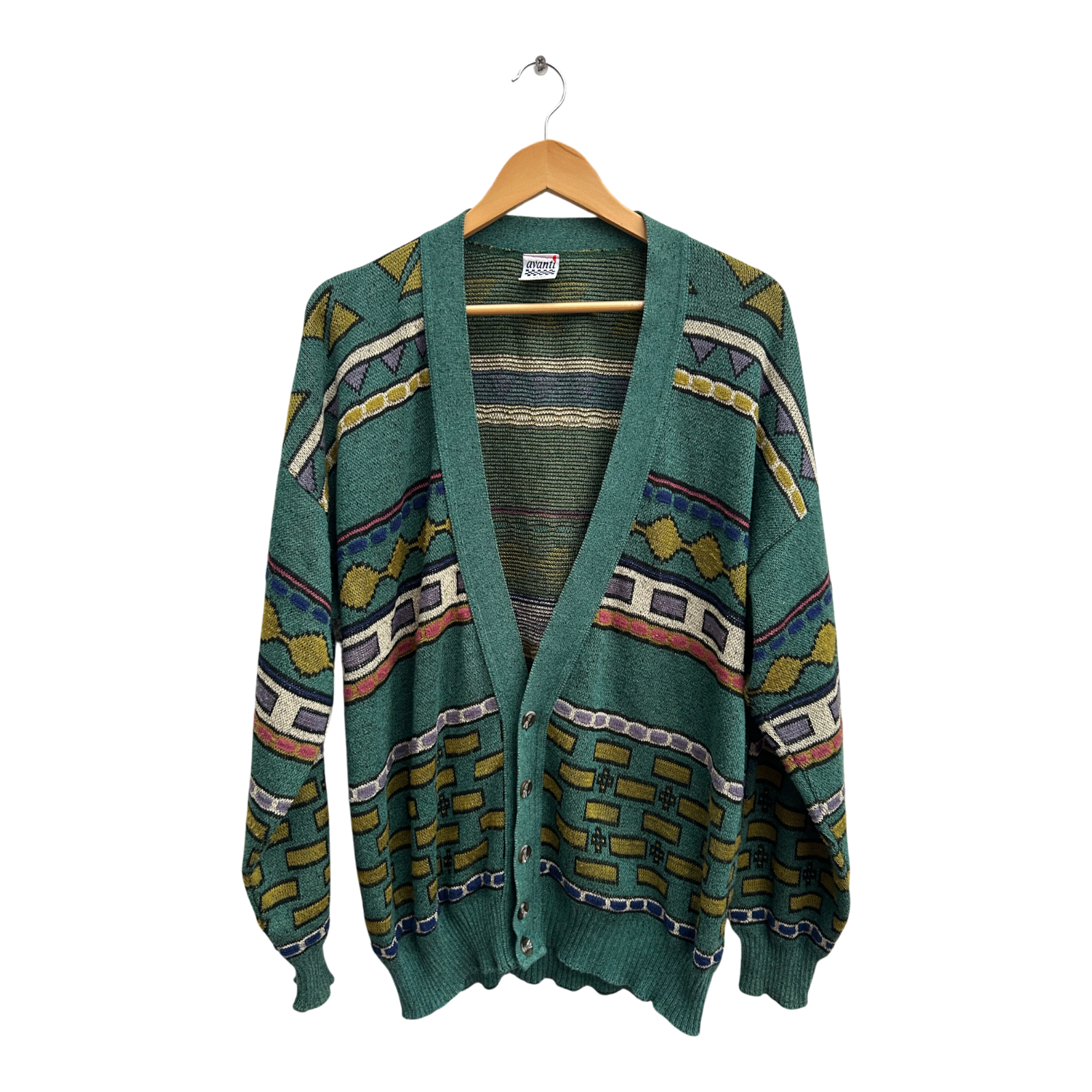 Auffällige Vintage-Strickjacke von Avanti in Größe 52 (entspricht L) mit typischem 80er-Jahre-Design. Der mehrfarbige Grafikstrick in Grün, Gelb, Lila und Blau verleiht diesem Stück einen unverwechselbaren Retro-Charme. Der Stoff ist angenehm weich, formbeständig und pflegeleicht dank des Baumwoll-Polyacryl-Mixes.