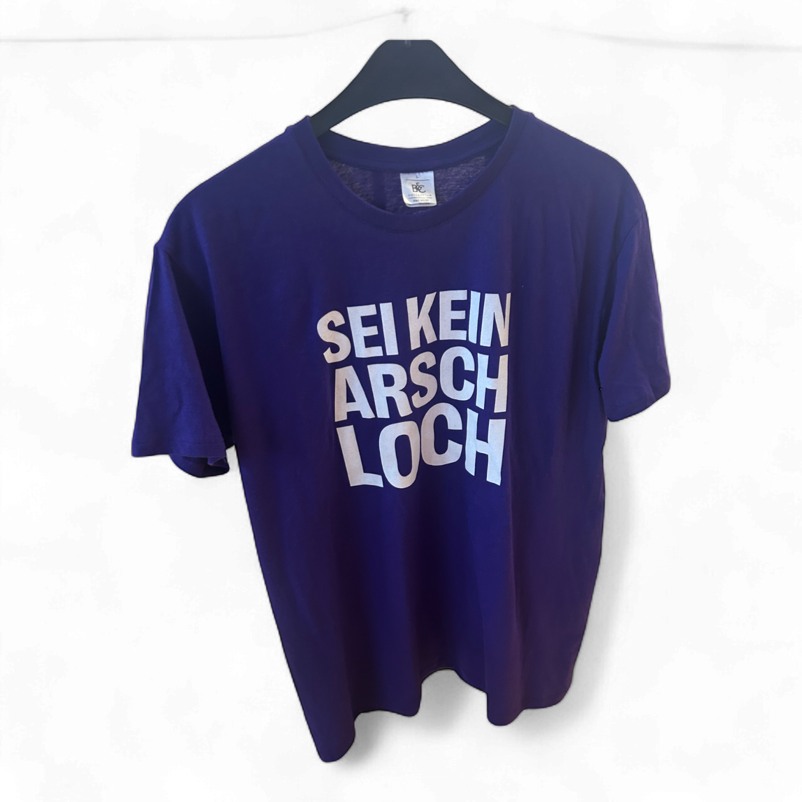 Markantes Statement-Shirt von B&C Collection in Größe L mit großem weißen Print „Sei kein Arschloch“ – ein echtes Statement für Haltung und Humor 😎🗯️