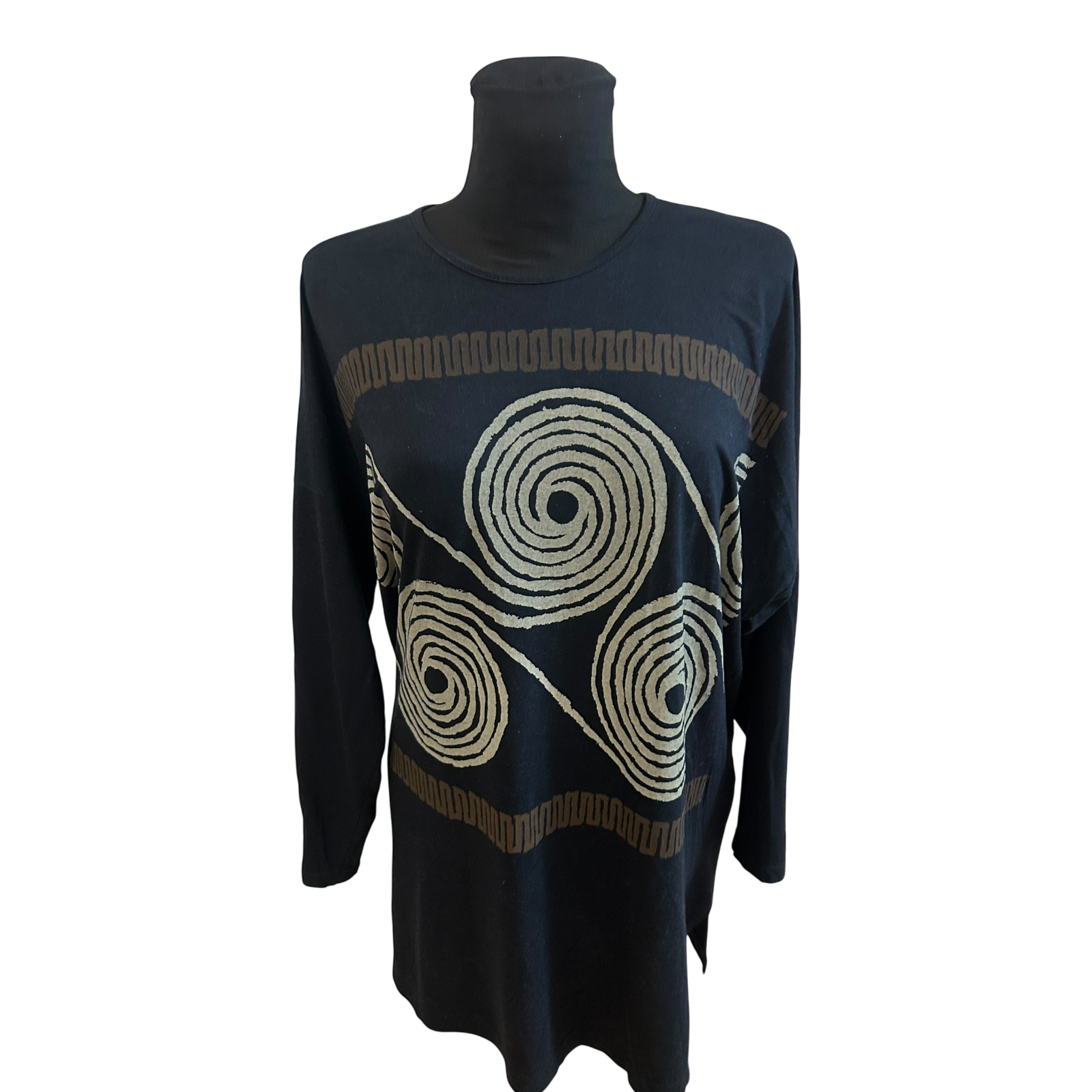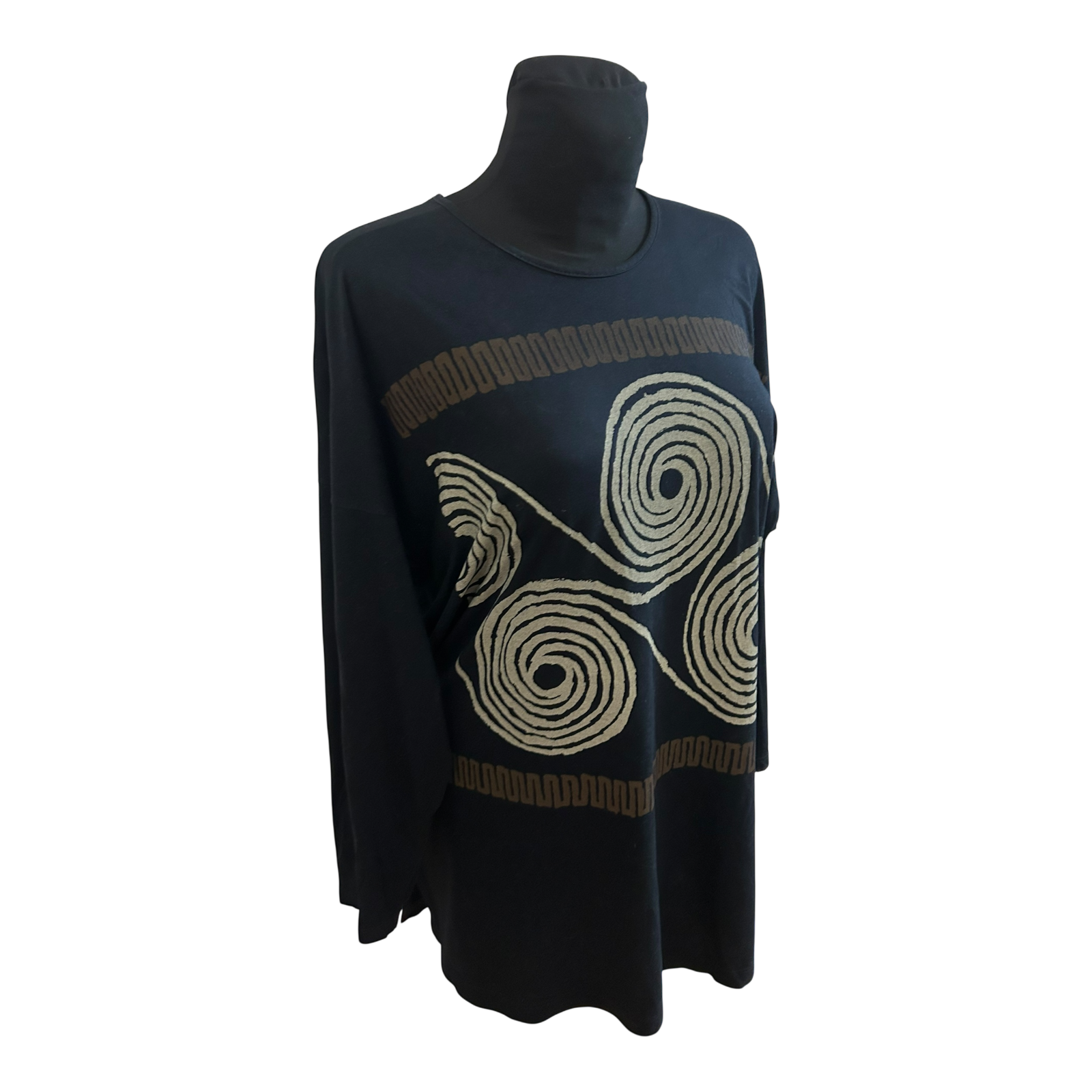 Außergewöhnliches Shirt von Beldona in Größe M in tiefem Schwarz mit markantem grafischem Muster 🖤 Der Schnitt ist bewusst sehr weit und locker gearbeitet und wirkt modern und lässig.