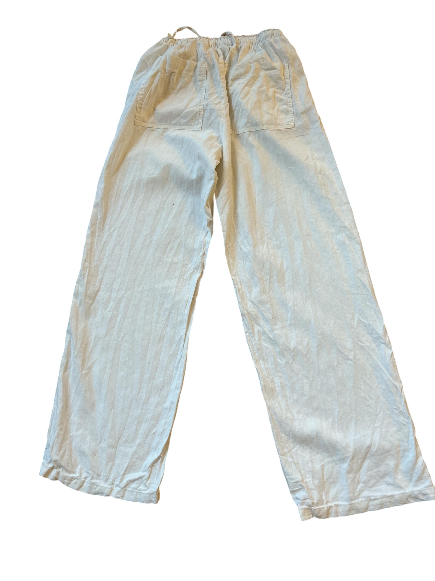 Weiße Leinenhose für Damen von Bershka in Größe XS. Mit bequemem Gummizug für eine flexible Passform, ideal für sommerliche Outfits.