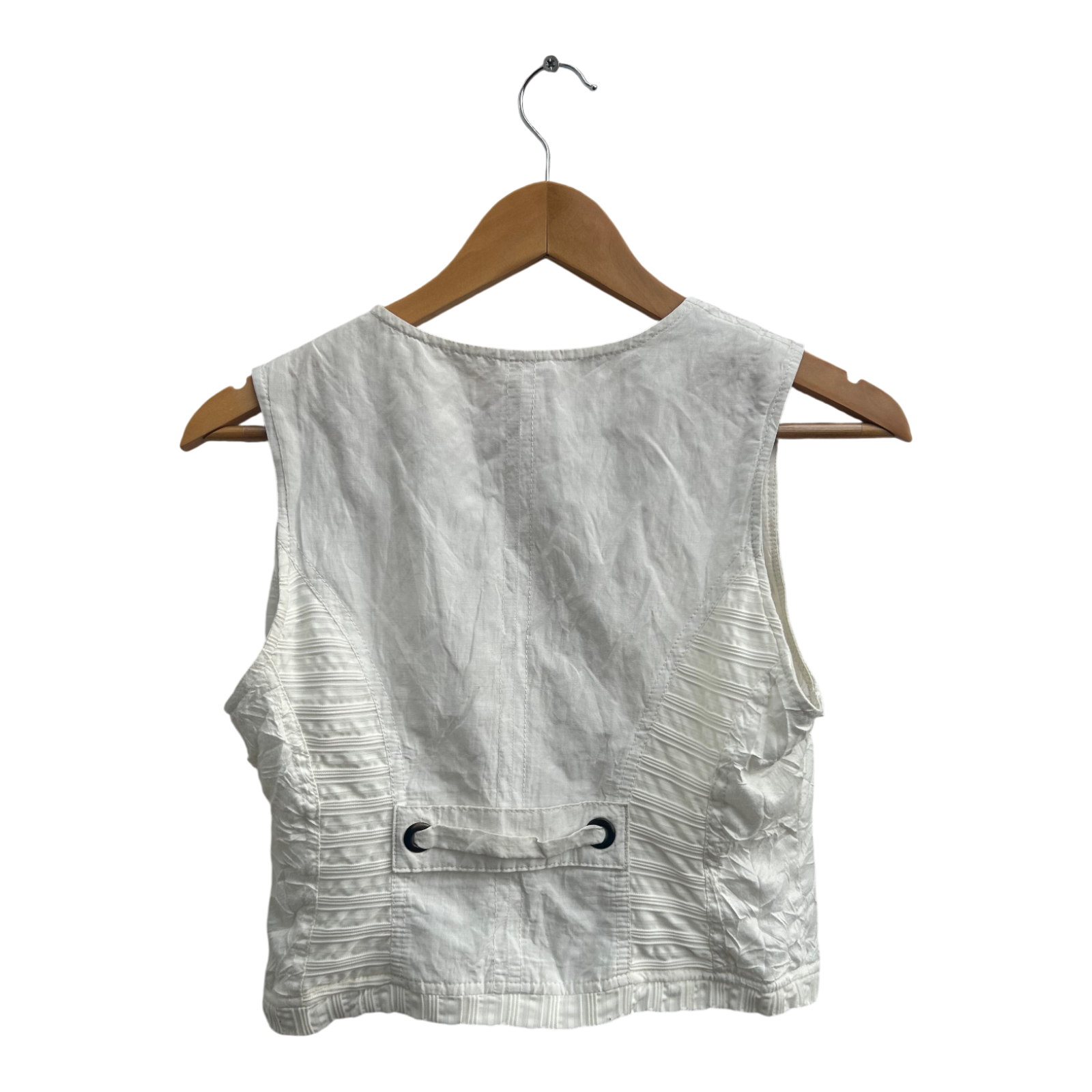 Leichte, figurbetonte Weste von BIBA in Größe 34. Das Modell besticht durch sein modernes Design in klassischem Weiß mit feiner Struktur und dekorativen Nähten. Besonders praktisch ist der beidseitige Reißverschluss, der sowohl von oben als auch unten geöffnet werden kann.