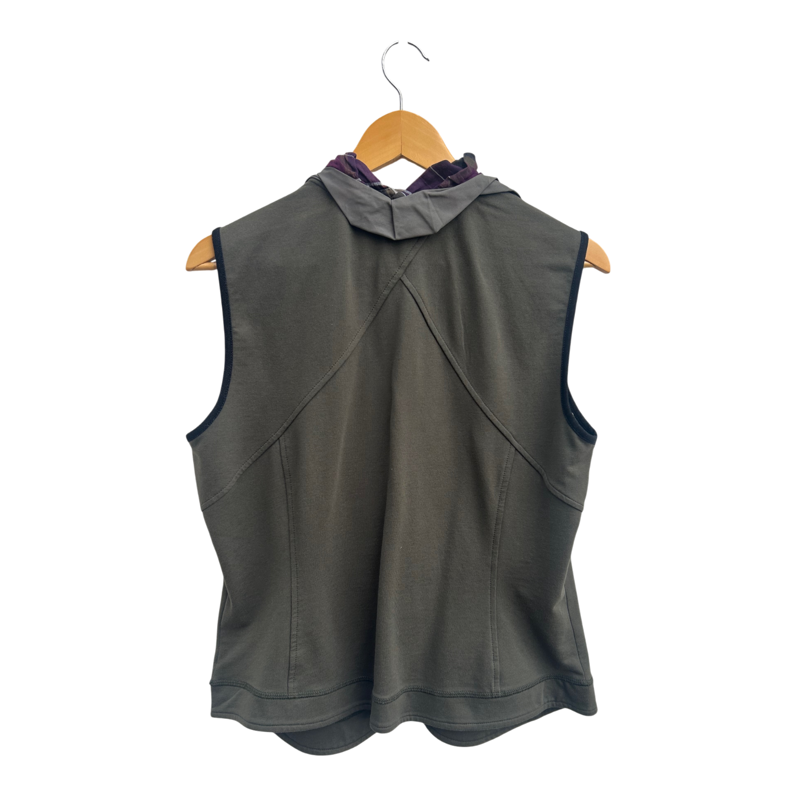 Ausdrucksstarke Weste von BIBA in modischem Khaki (Größe 40). Das Modell kombiniert sportive und feminine Elemente: zarte Rüschen in Lila- und Karotönen, feine Samtpaspeln, dezente Glitzerakzente und florale Einsätze an den Schultern. Durch den hochwertigen Stretchstoff sitzt sie figurbetont und bequem zugleich.