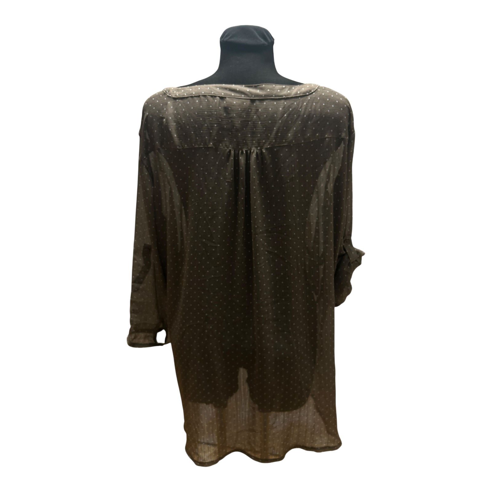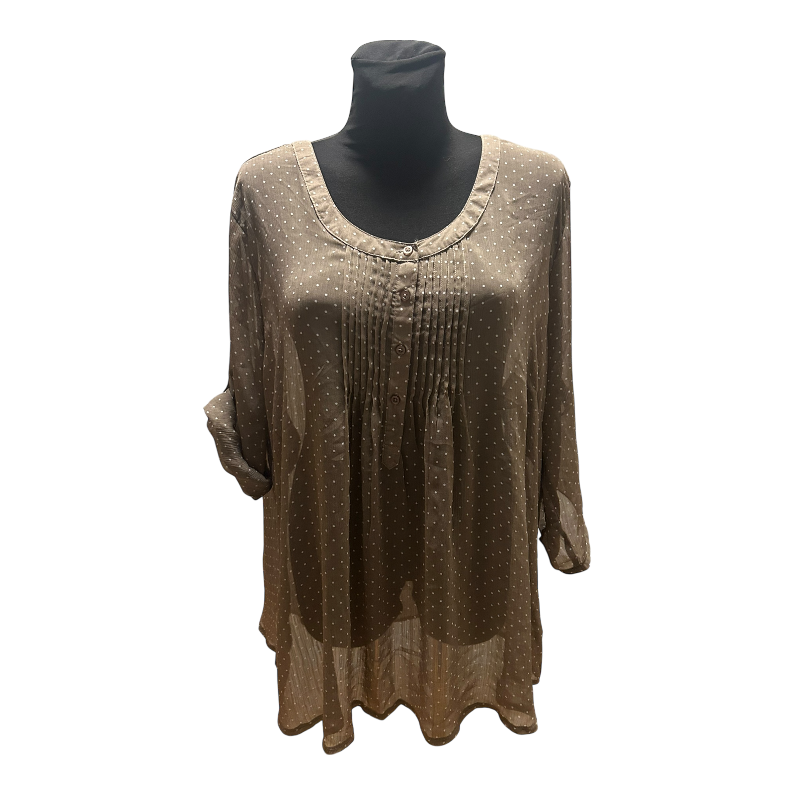 Wunderschöne transparente Bluse von Bexley’s in Taupe mit feinem Punkte-Muster und fließendem Schnitt. Die Bluse besitzt eine kleine Knopfleiste im Brustbereich sowie Dreiviertelärmel mit einer Länge von ca. 48 cm. Die einfache Brustweite beträgt ca. 68 cm, die Gesamtlänge liegt bei ca. 78 cm. Das Material besteht aus 100% Polyester und fällt weich und leicht. Das Größenetikett fehlt, die Größe wurde anhand der Maße auf etwa 50 eingeschätzt.