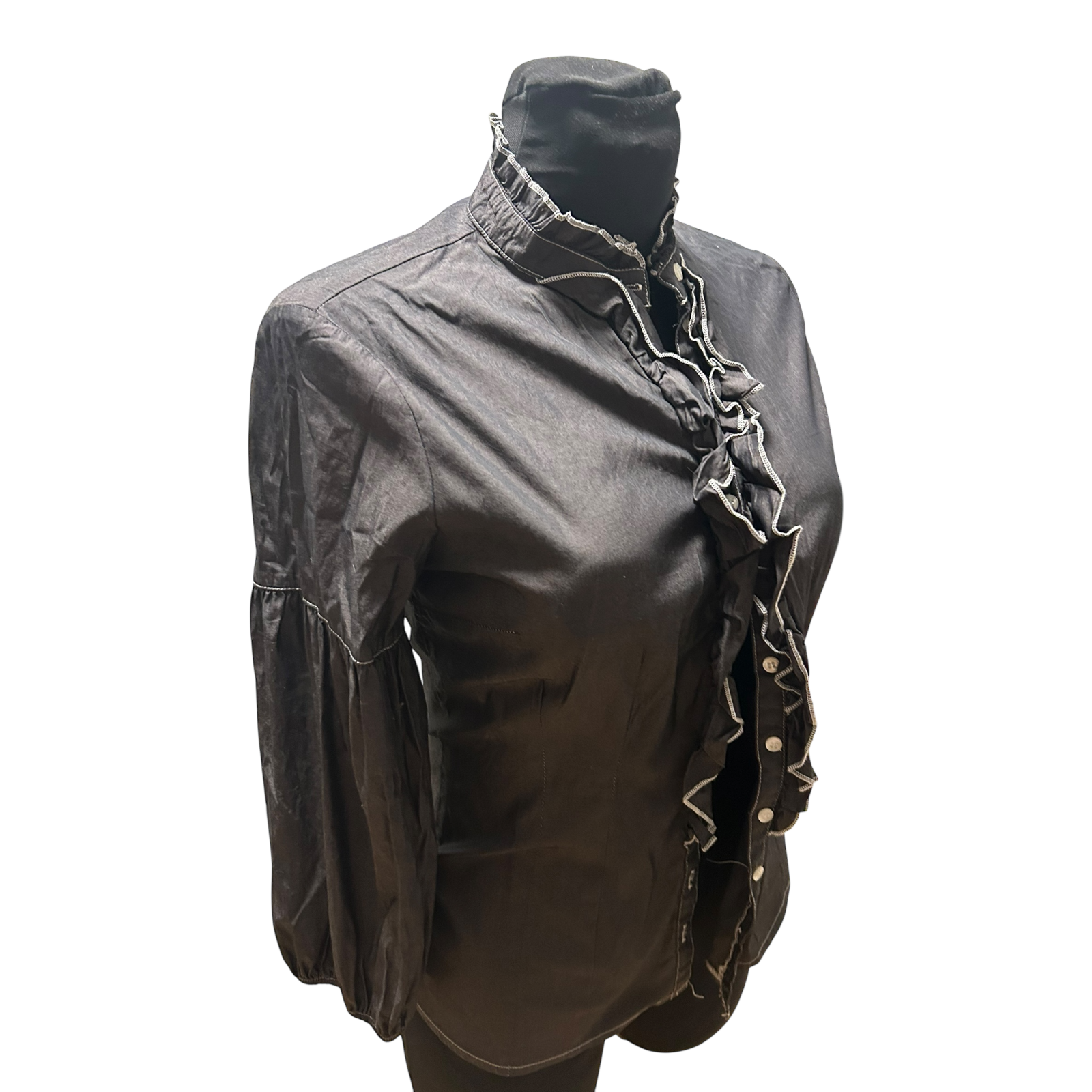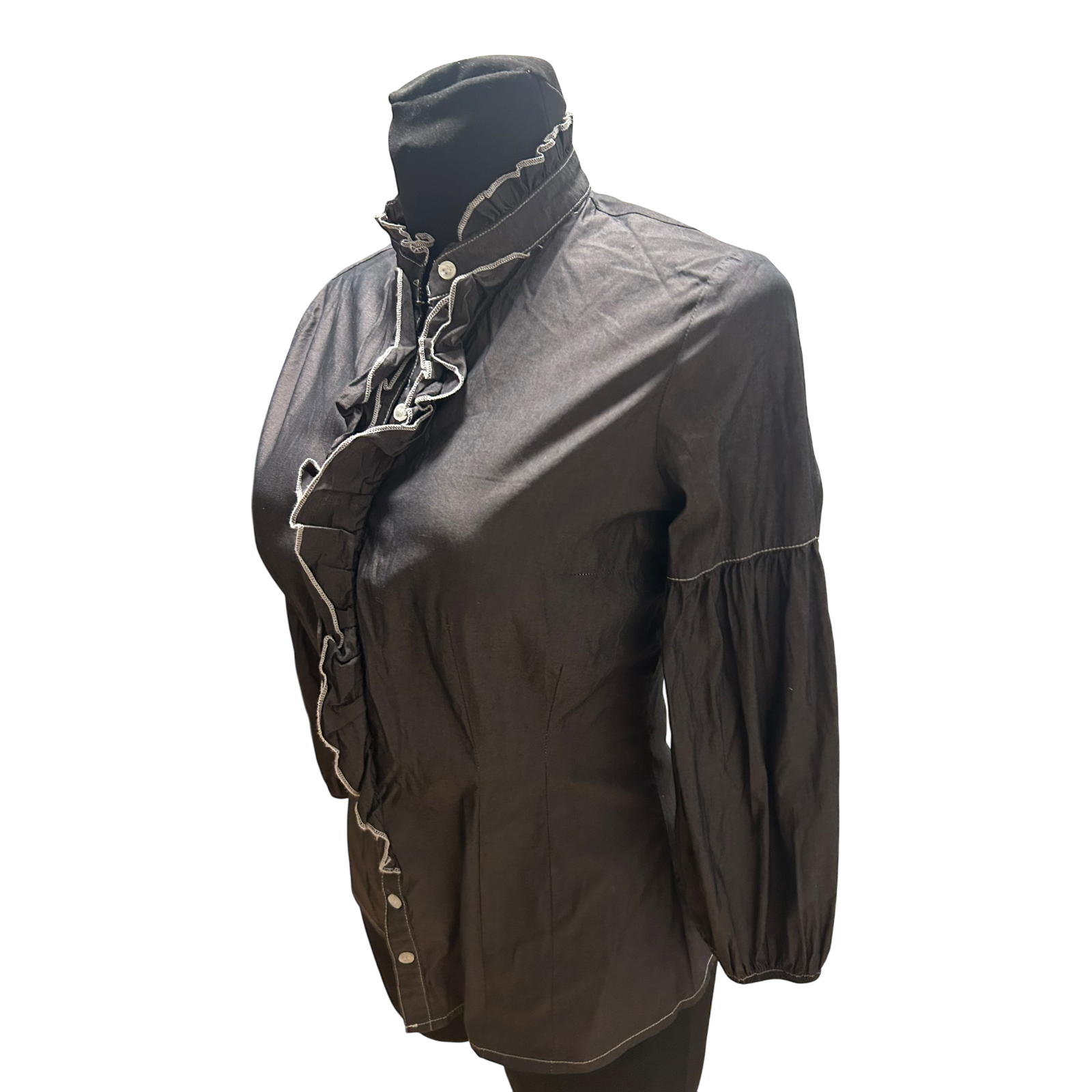 Wunderschöne braune Bluse in der Größe XS mit femininen Rüschen entlang der Knopfleiste und am Stehkragen 🤎 Die Bluse ist leicht stretchig und schmiegt sich angenehm an. Der Dreiviertelarm ist leicht puffig gearbeitet und misst ca. 48 cm.
