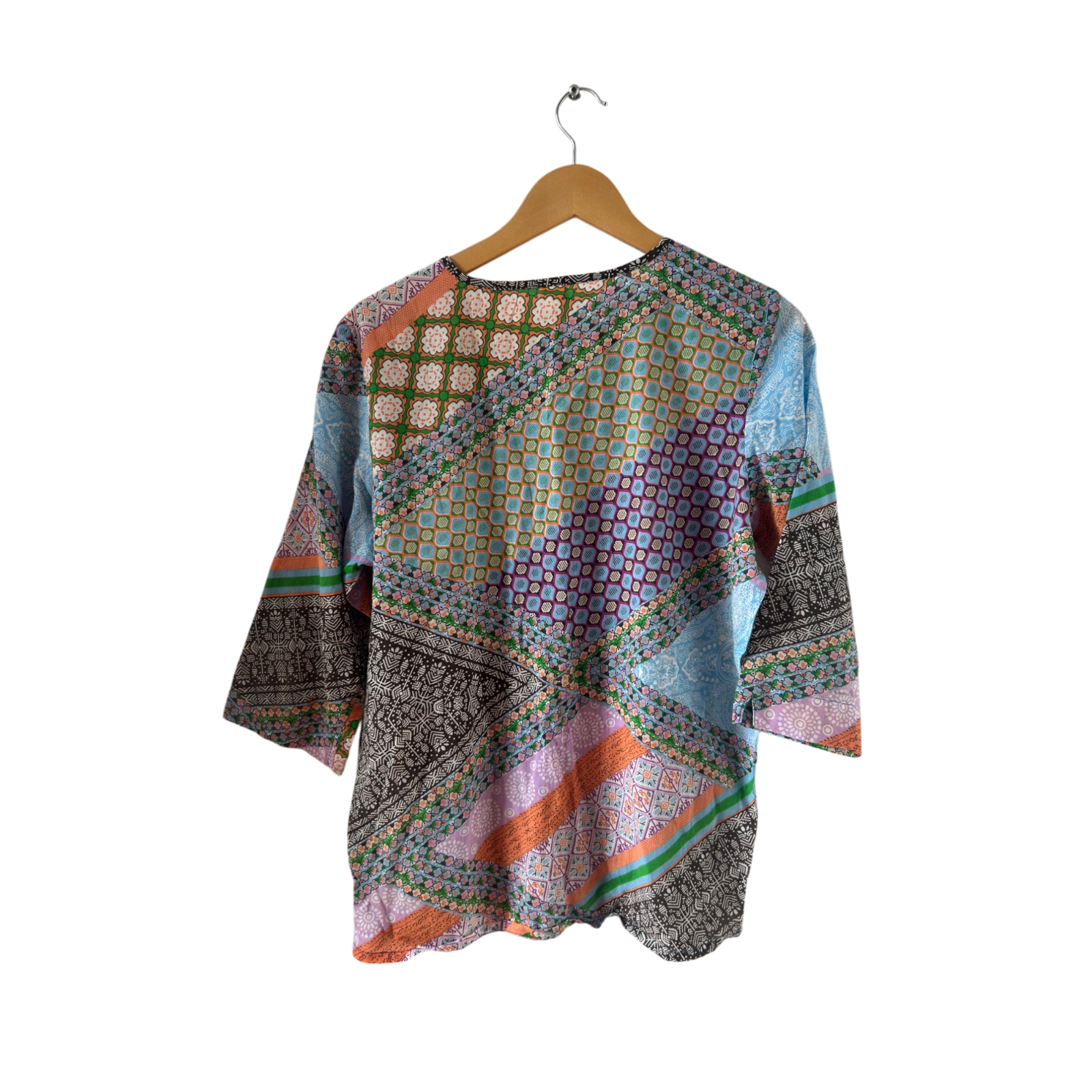 Diese farbenfrohe Boho-Bluse in Größe 40 begeistert mit einem kunstvollen Patchwork-Muster im Ethno-Stil 🎨. Der weite Schnitt, die lockere 3/4-Ärmellänge und die Knopfleiste mit kleinen Biesen vorn verleihen der Bluse eine leichte, sommerliche Ausstrahlung. Sie besteht vermutlich aus Baumwolle (ohne Etikett), fühlt sich angenehm weich an und eignet sich ideal für Festivals, Urlaub oder lässige Freizeitlooks. Die Brustweite beträgt ca. 53 cm, die Länge ca. 67 cm – locker sitzend und bequem tragbar.