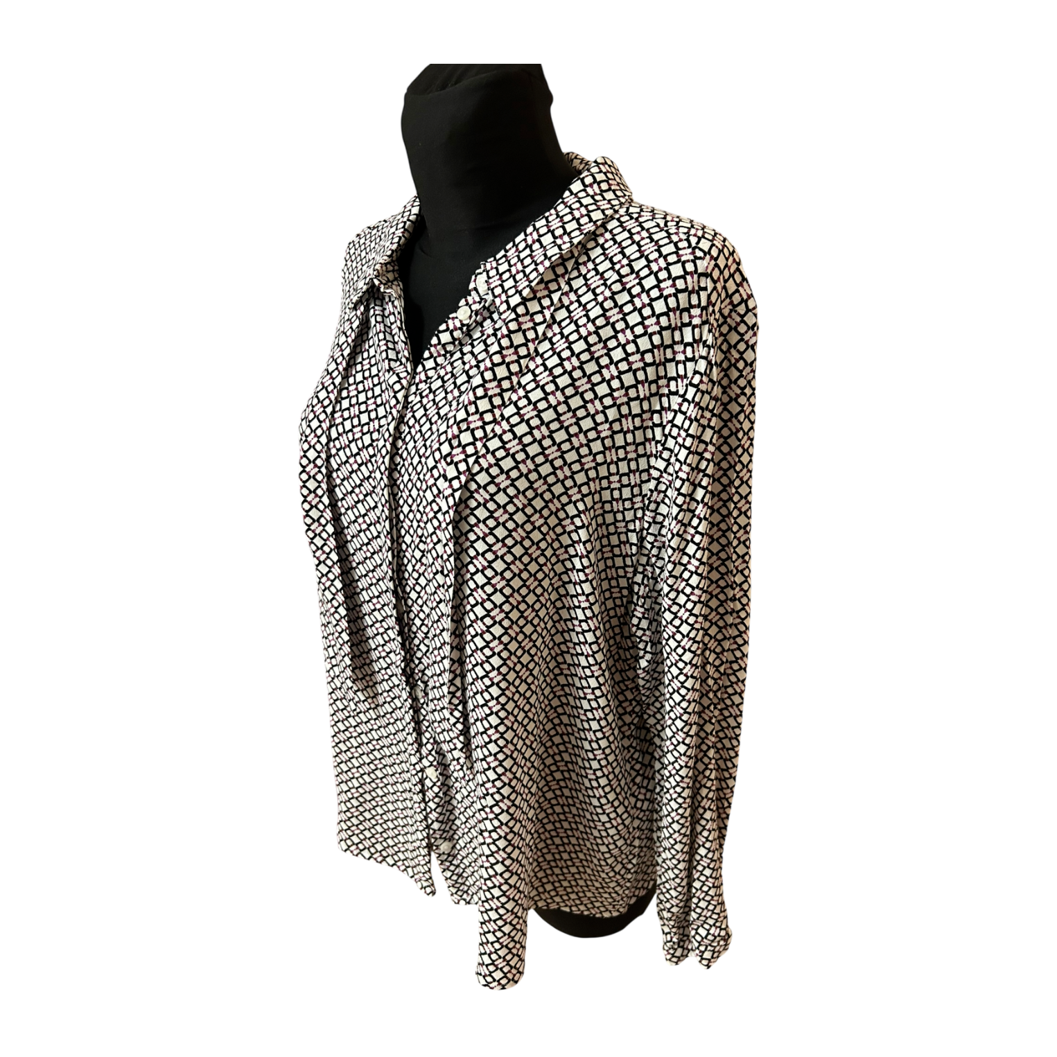Sehr stilvolle Bluse von Bonita in Größe 42 🤍 Die Bluse ist weiß mit schwarzem und violettem Muster und wirkt dadurch modern, aber dennoch klassisch. Der Stoff aus 100% Polyester fällt weich und leicht fließend, was der Bluse eine elegante Ausstrahlung verleiht.