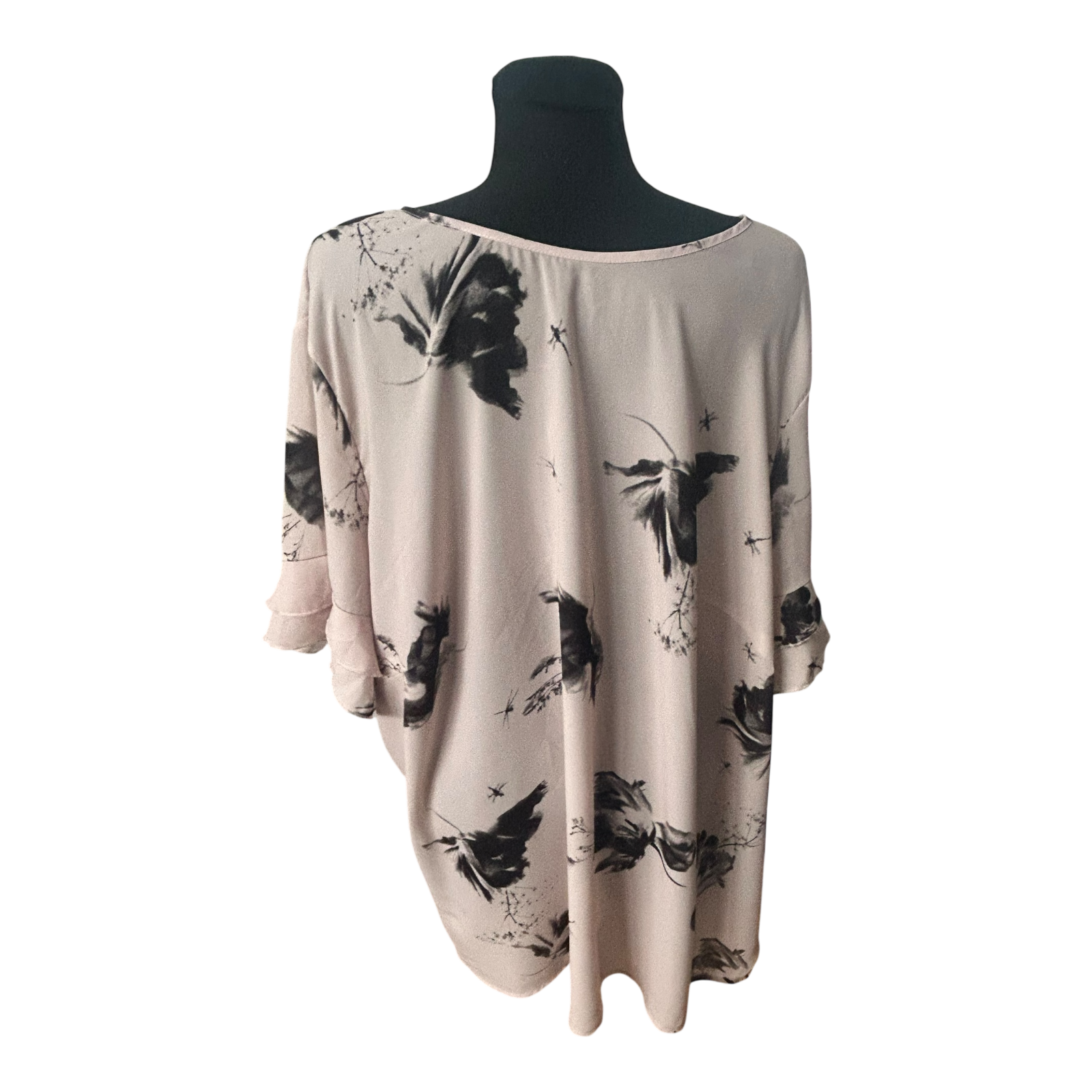 Bonprix Damen Bluse Größe 54 Rosé Schwarz Muster V-Ausschnitt 3/4-Arm