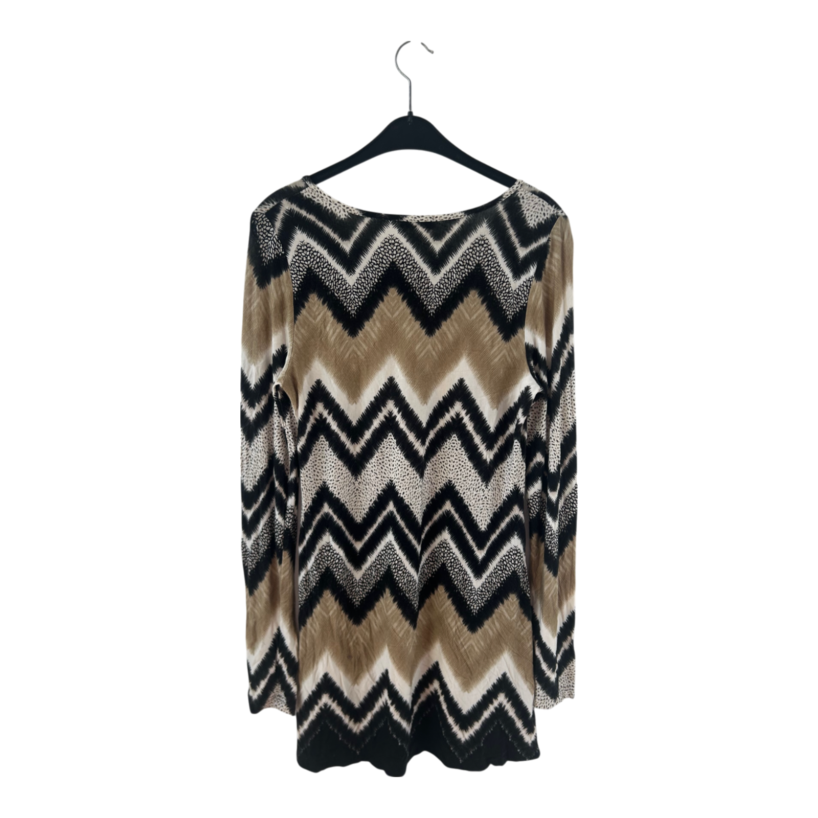 Leichtes, bequemes Kleid von Boysen’s in Gr. 38 mit auffälligem Ethno-Zickzack-Muster in Naturtönen. Aus angenehm fließender Viskose mit Stretchanteil, ungefüttert. Rundhalsausschnitt mit kleiner Zierschleife, lange Ärmel und eine figurumspielende Passform – ideal für Alltag, City oder Urlaub 🌿. Brustweite ca. 40 cm. Sehr guter Zustand.