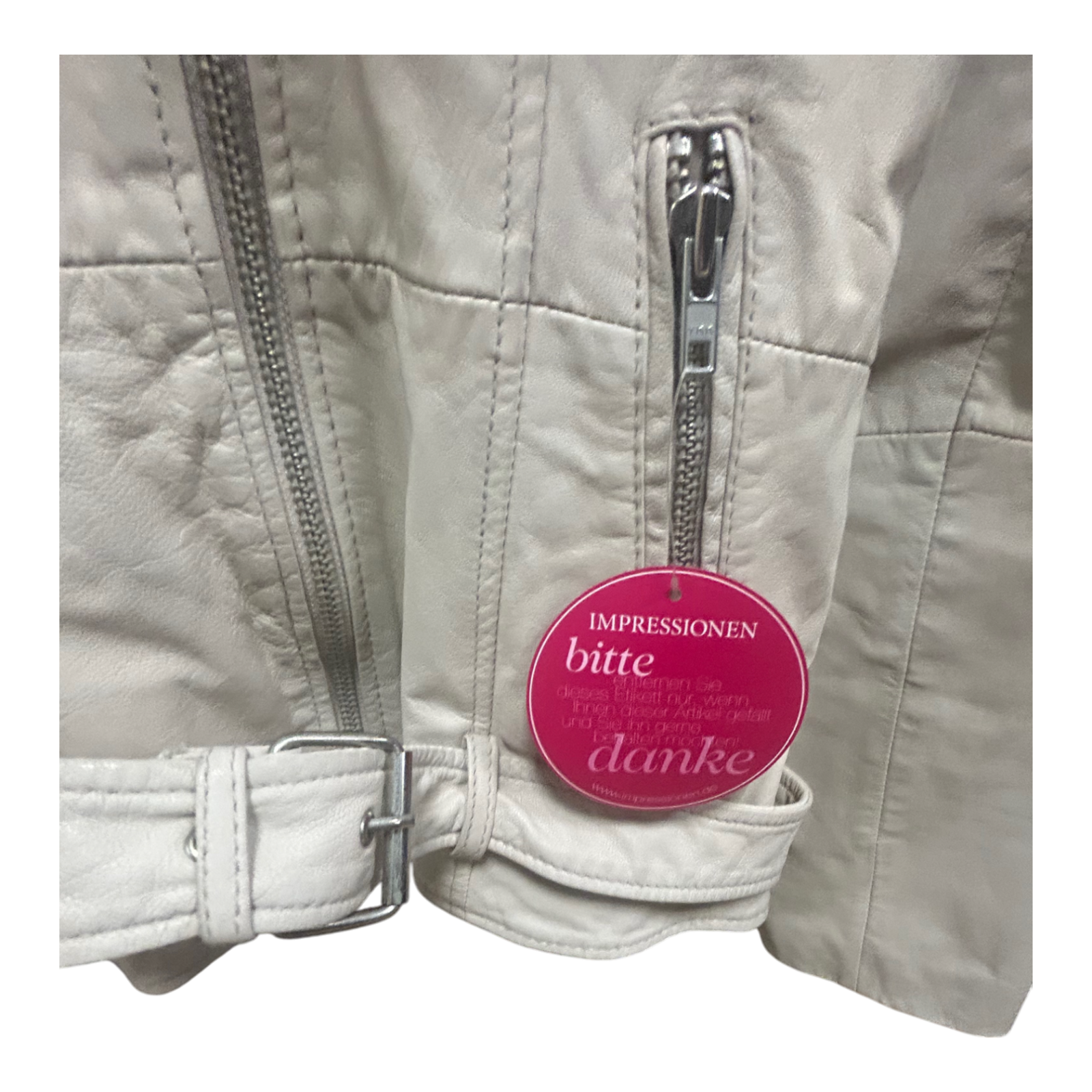 Die Farbe ist ein feines Cremeweiß, das sich stilvoll kombinieren lässt – sowohl zu Jeans als auch zu Kleidern. Die Maße: Brustweite 52 cm, Länge 62 cm, Ärmellänge 59 cm. Trotz neuwertigem Zustand zeigt die Jacke leichte Staubspuren im oberen Rückenbereich vom Lagern – diese lassen sich mit einem weichen Tuch oder Lederpflege leicht entfernen. 🧼