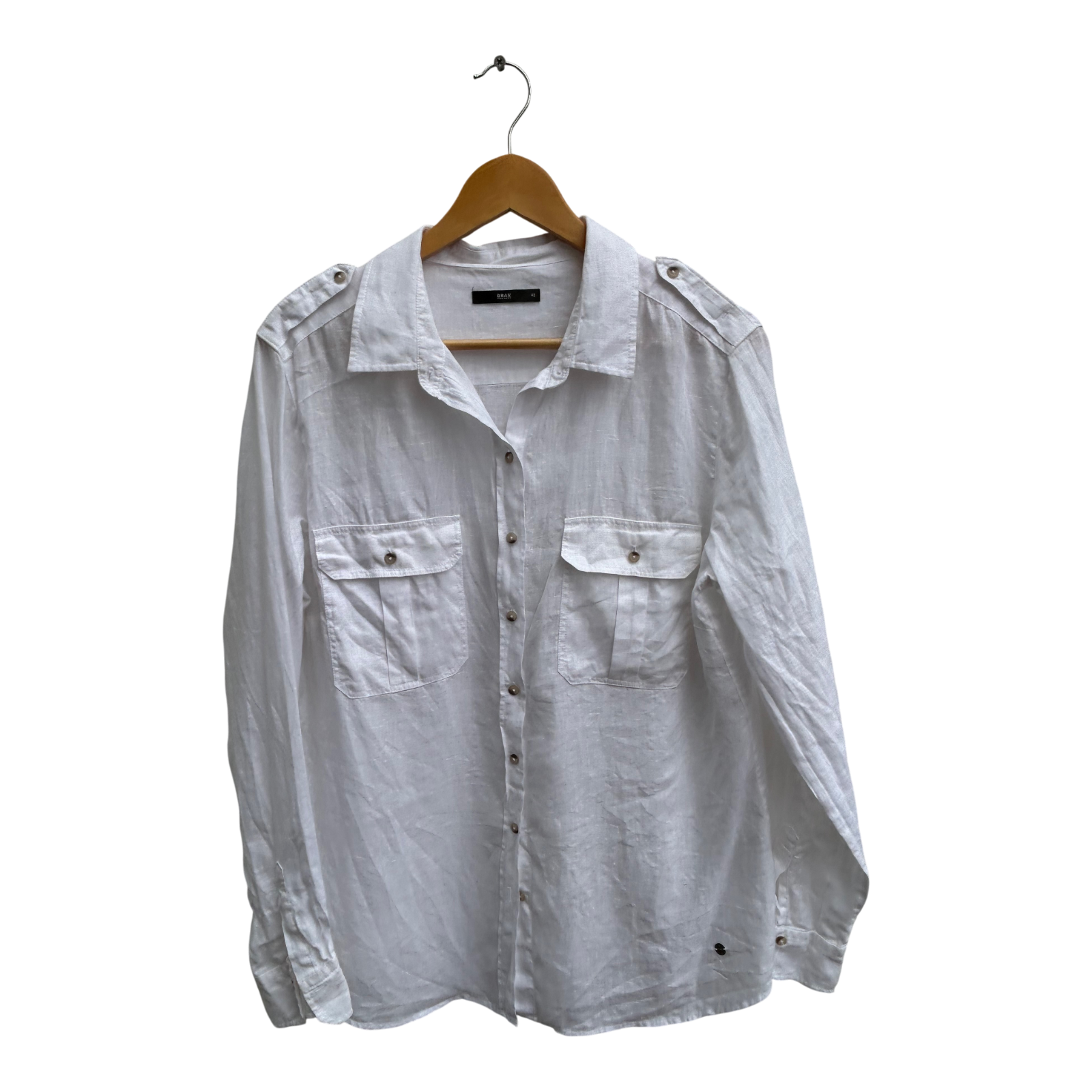 Edle Leinenbluse von Brax in Größe 42 aus 100 % Leinen. Brustweite 54 cm, Länge 75 cm, Ärmellänge 65 cm. Die weiße Hemdbluse überzeugt durch ihr hochwertiges Material und ihre vielseitigen Details: mit klassischen Brusttaschen, Schulterriegeln, durchgehender Knopfleiste und praktischen Krempelärmeln, die sich zum Kurzarm umfunktionieren lassen. Das atmungsaktive Leinen sorgt für ein angenehm kühles Tragegefühl, ideal für warme Tage. Ein stilvoller Begleiter für Freizeit, Büro oder Urlaub – zeitlos, natürlich und elegant.
