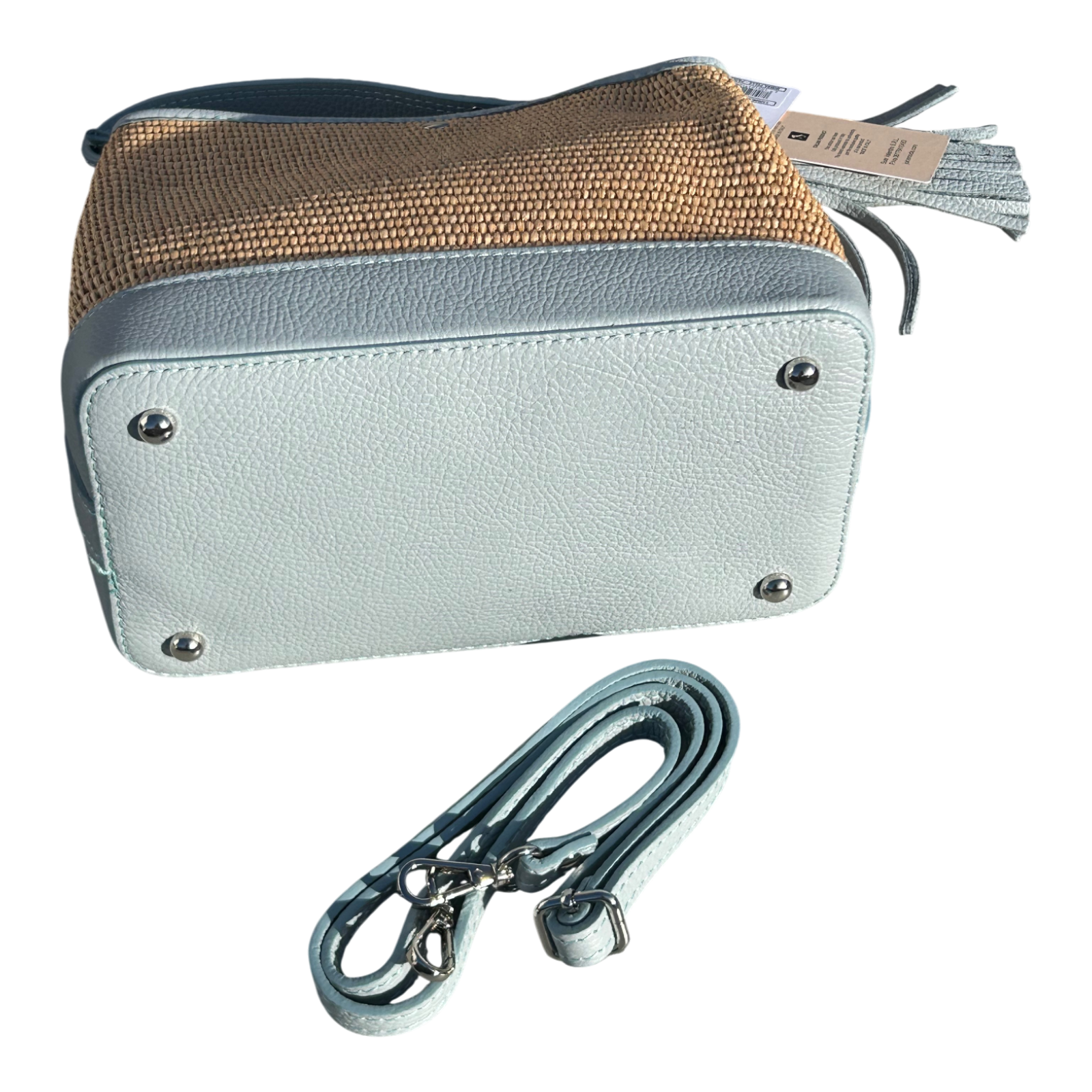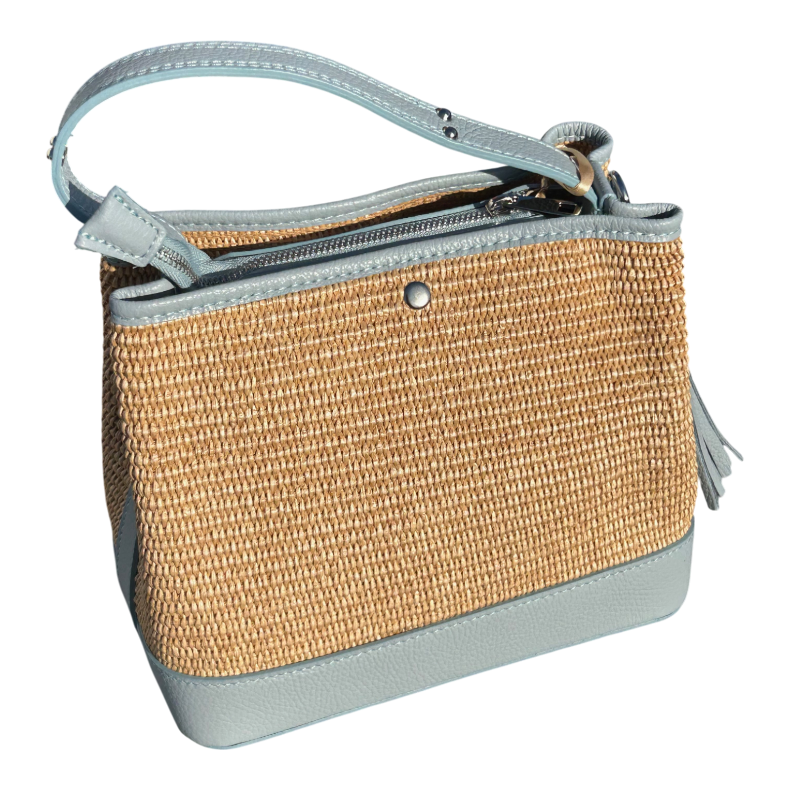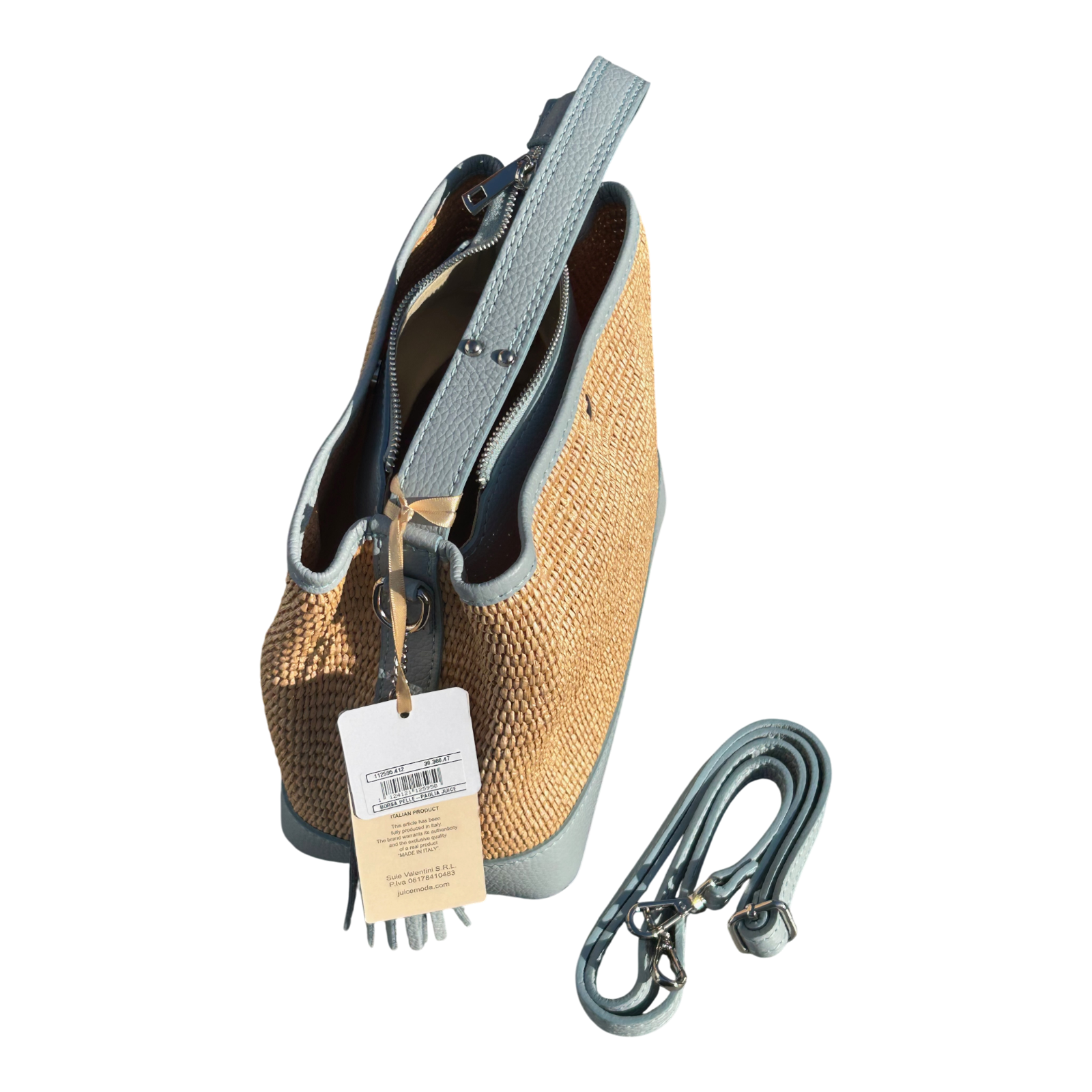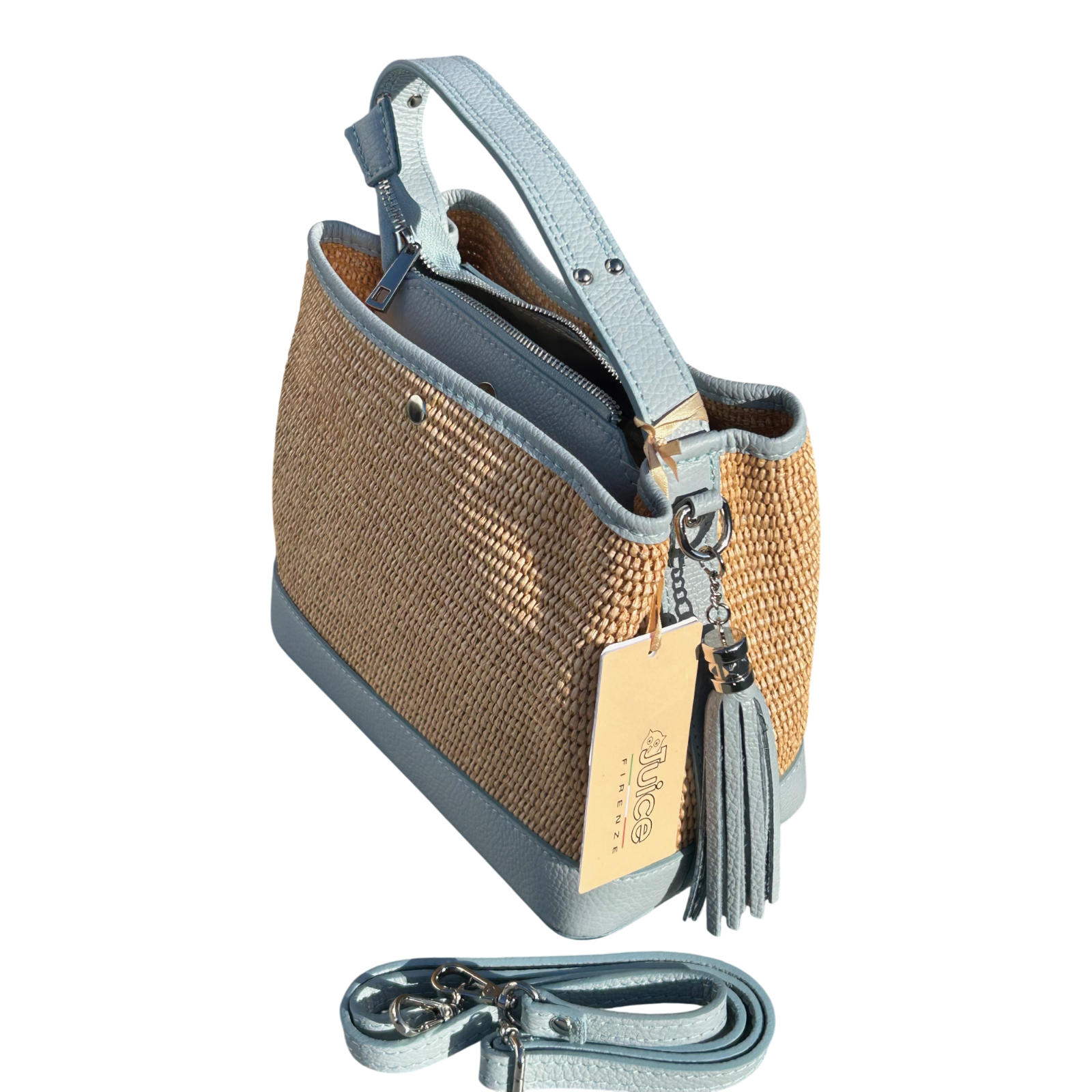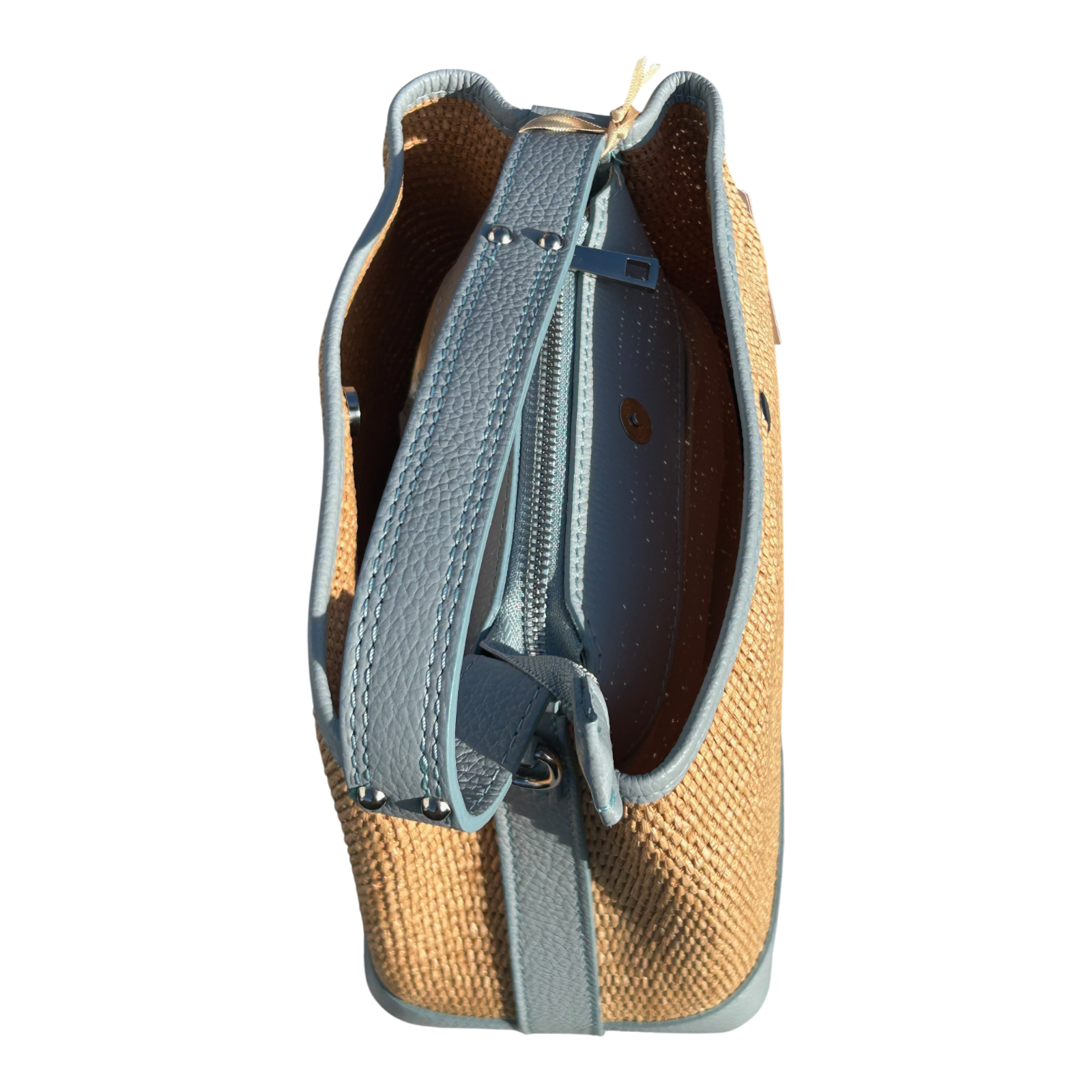 Bucket Bag Hellblau Echtleder Raffia Tasche Italien Sommer Handtasche Elegant Neu