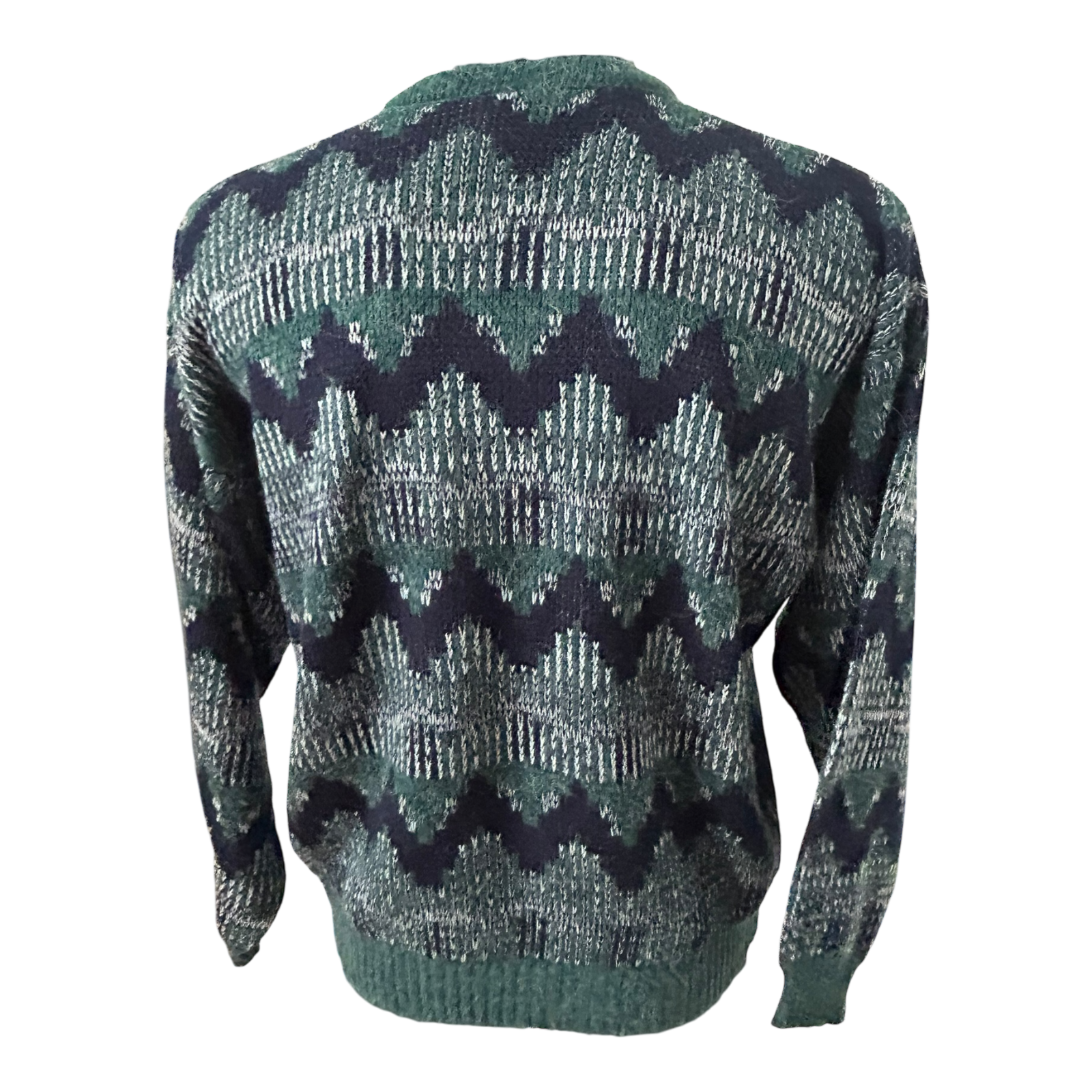 Ein echtes Vintage Kultstück von C&A in Größe L entsprechend etwa Größe 52 💚 Dieser markante Herrenpullover überzeugt mit seinem ausdrucksstarken grafischen Muster in Grün Dunkelblau und Creme und bringt einen authentischen 90er Jahre Look in jedes Outfit.