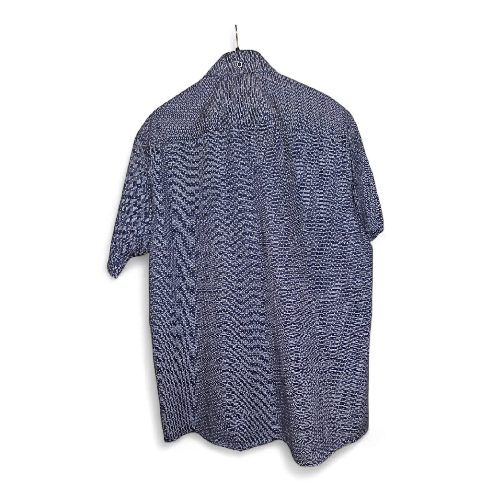 Ein elegantes Kurzarm-Hemd von CAMPIONE in Größe L, in edlem Dunkelblau mit dezenten roten Punkten. Perfekt für stilvolle Freizeit- oder Smart-Casual-Looks, bietet es eine bequeme Passform und hochwertige Verarbeitung. Ideal, um jedem Outfit eine raffinierte Note zu verleihen.