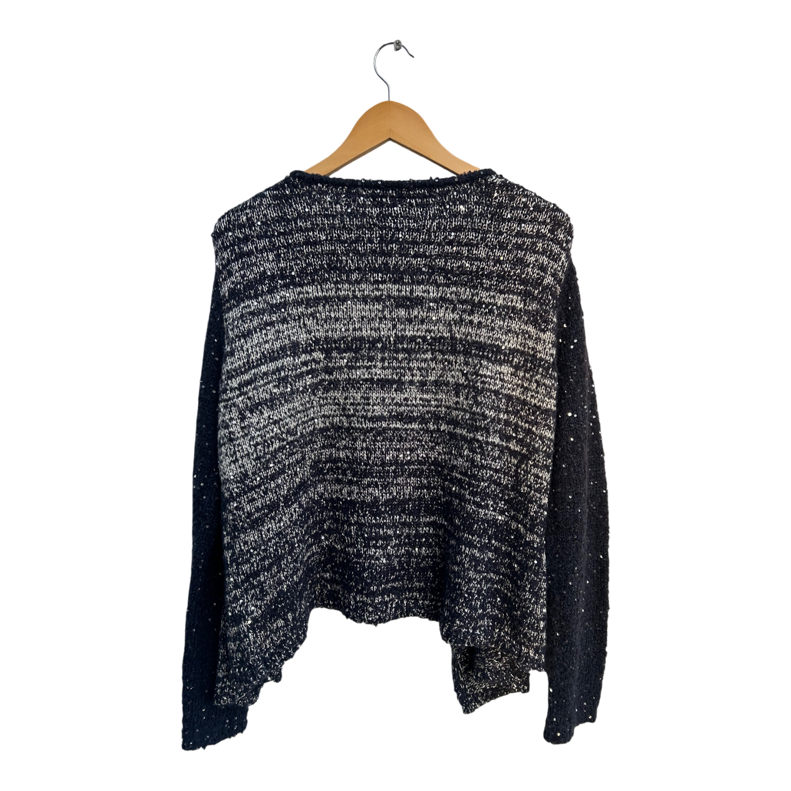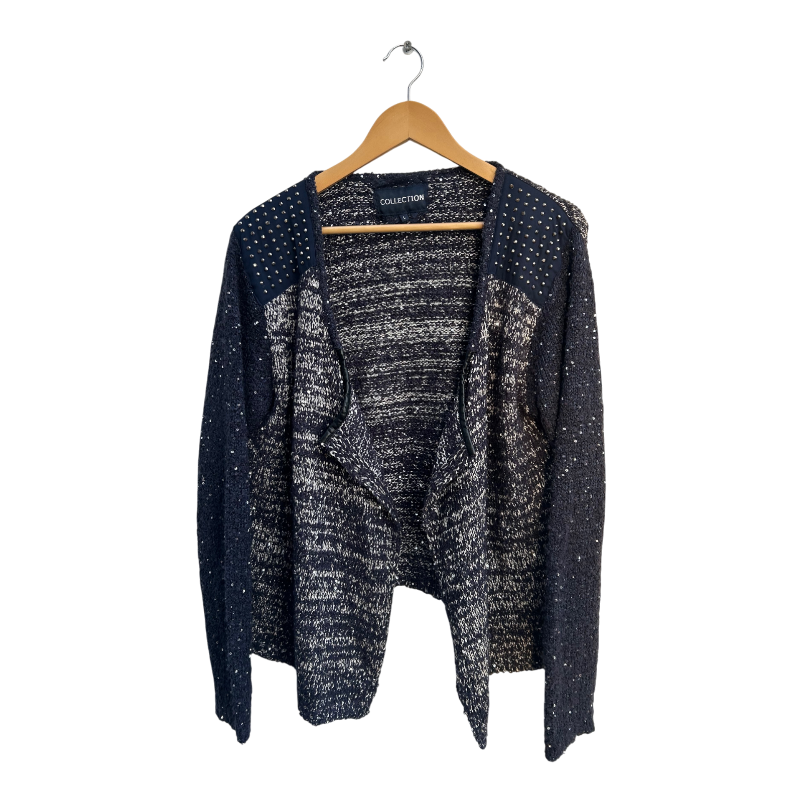 Die Jacke funkelt dezent bei Bewegung und kombiniert ein modisches Blau-Weiß-Melange mit glitzernden Fäden. Der Schnitt ist offen und locker fallend, ohne Verschluss – ideal für einen modernen Lagenlook. Schulterpartien mit Nietenbesatz sorgen für das gewisse Extra.