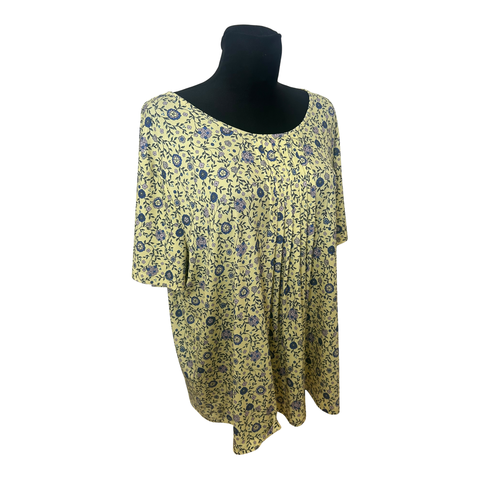 Leicht fallende Kurzarmbluse in Größe 50 in frischem Gelb mit blauem Blumenmuster. Die dekorative, vorne angenähte Raffung sorgt für eine schöne Silhouette und verleiht der Bluse eine feminine Ausstrahlung 🌼