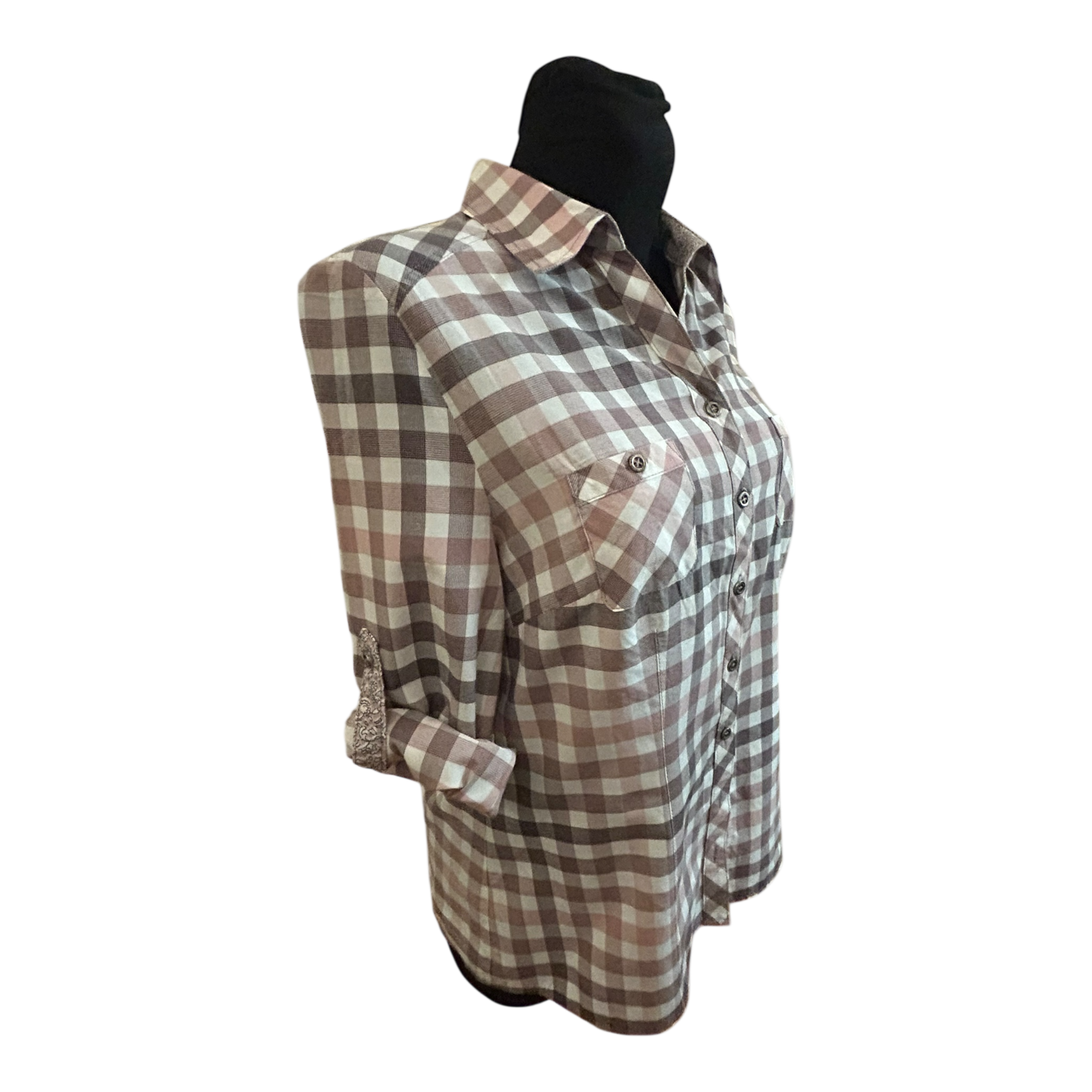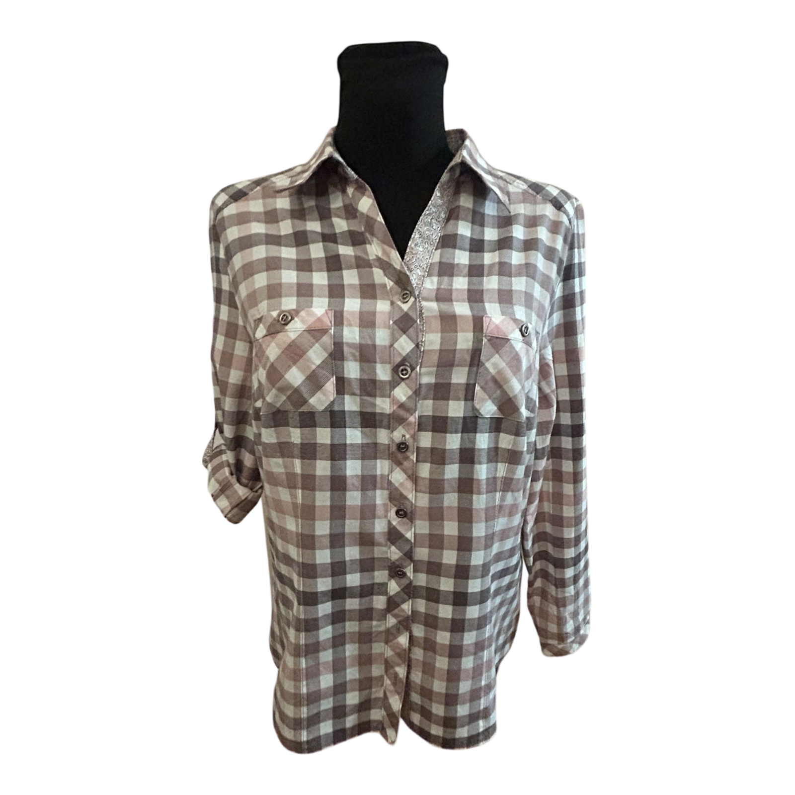 Damen Bluse Größe 40 Karo Grau Rosa Langarm Krempelärmel Baumwollmix