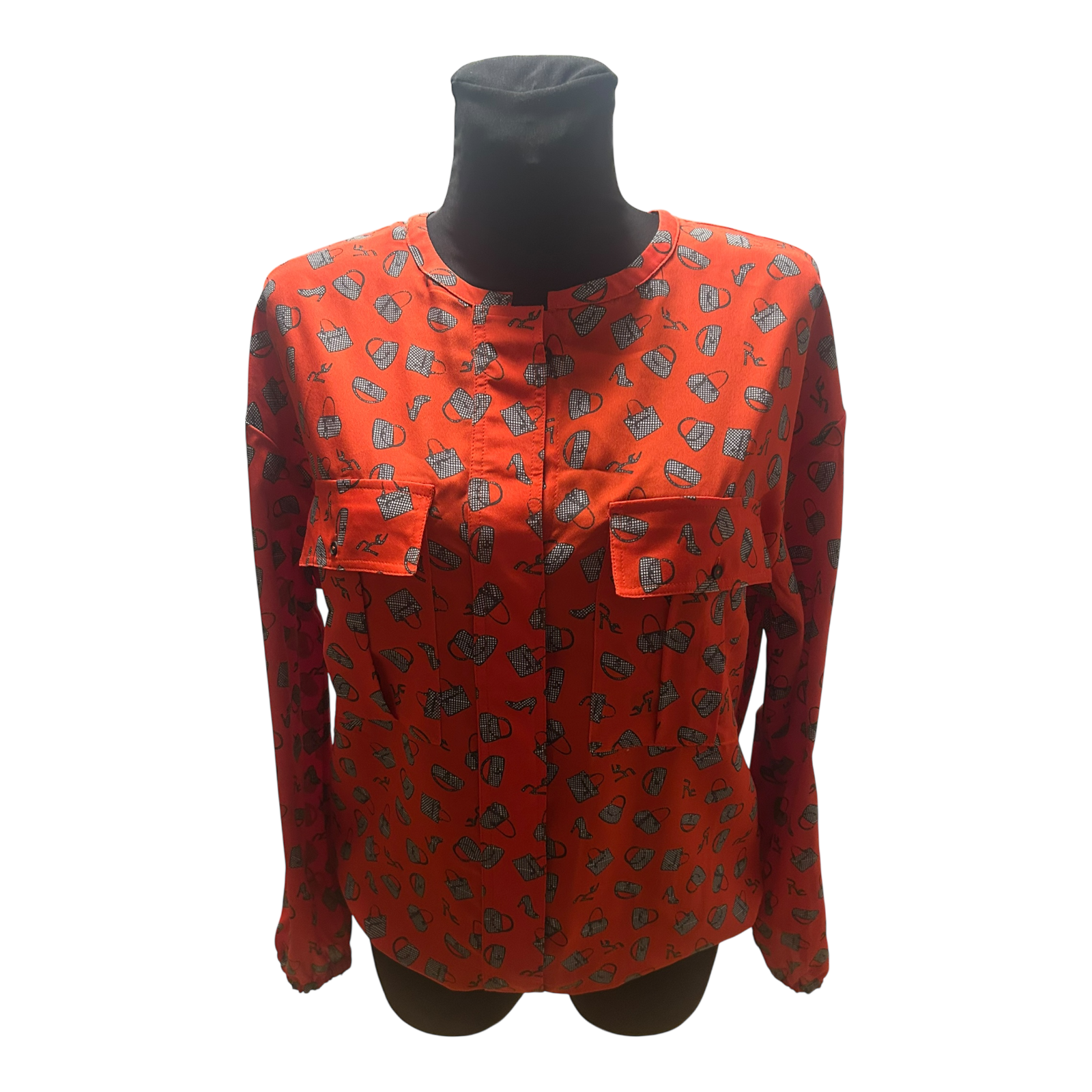 Diese auffällige Damenbluse in kräftigem Rot mit schwarzem Allover-Muster ist ein echter Hingucker ❤️ Die Bluse verfügt über eine verdeckte Knopfleiste, zwei markante Brusttaschen sowie einen leicht hochstehenden Kragen. Die Ärmel sind angenehm weit geschnitten und schließen mit einem Gummizug ab, ebenso sorgt der elastische Saum für einen locker fallenden Sitz.