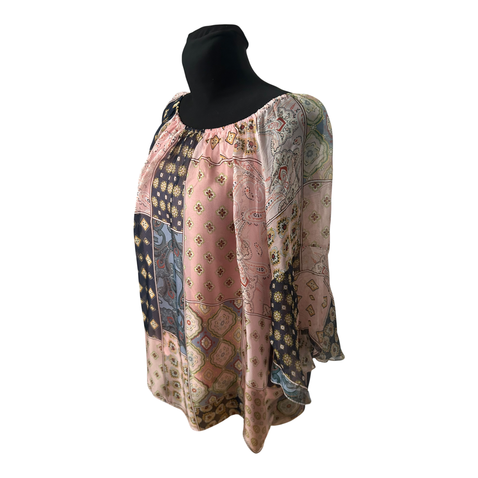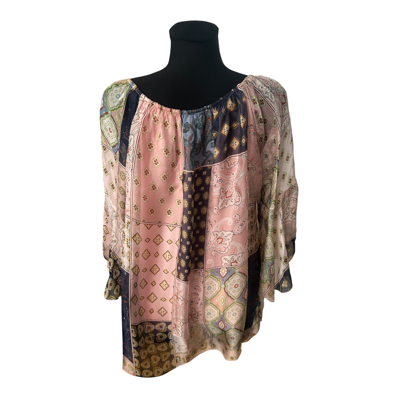 Damen Bluse Tunika Gr L Patchwork Muster Seide Viskose 3/4 Arm Elegant