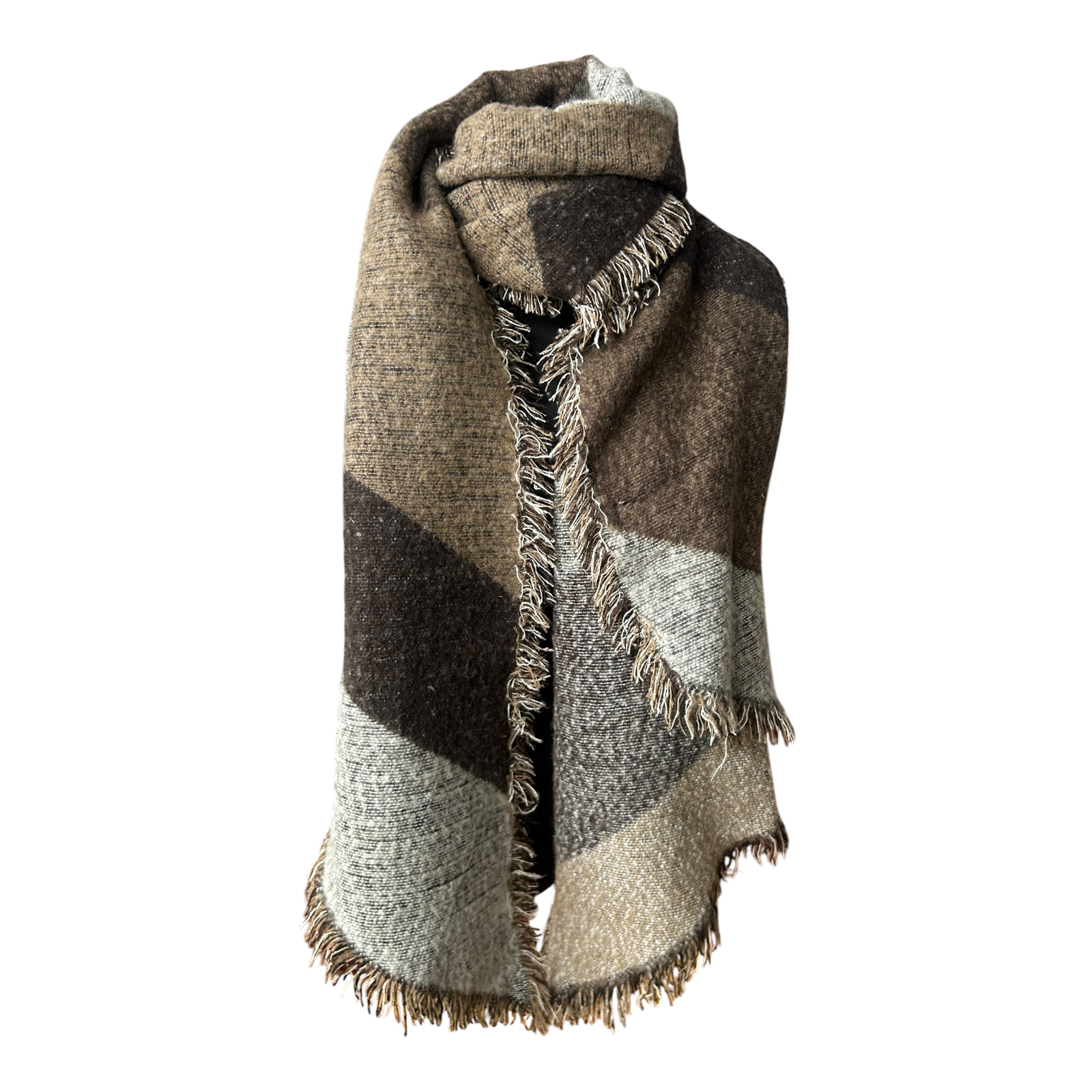 Dieser sehr große Schal ist weich im Griff und zeigt ein deutliches, großflächiges Muster aus breiten Farbflächen in Braun- und Naturtönen. Die einzelnen Flächen sind klar voneinander abgesetzt und verleihen dem Schal eine moderne, grafische Optik. Durch die asymmetrischen Spitzen wirkt das Design besonders lässig und stilvoll.