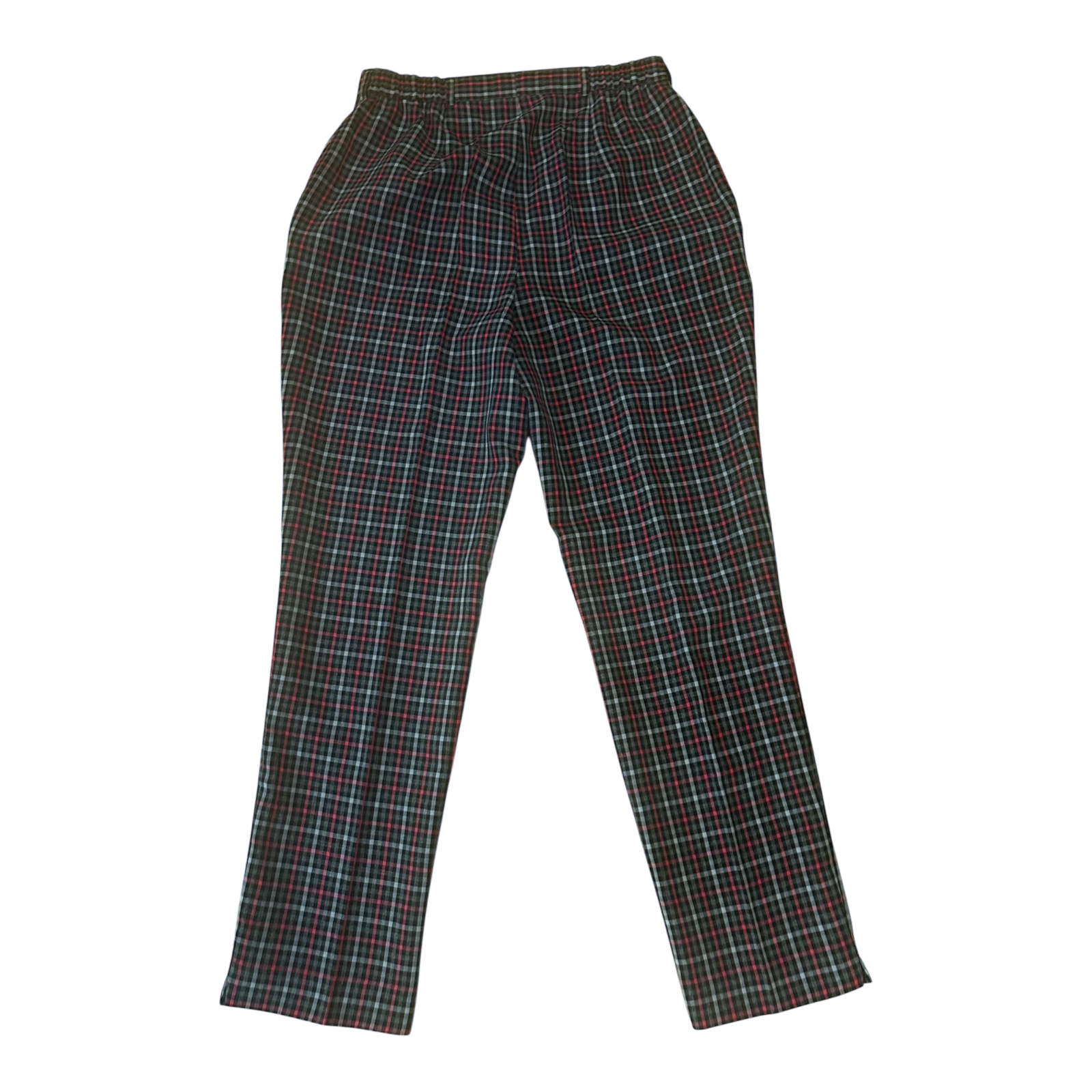 Schöne, dünne Vintage-Stoffhose mit klassischem Karomuster in Grau, Rosa und Schwarz. Der hohe Bund sorgt für eine feminine Silhouette, während der leichte Stoff angenehm fällt und sich gut tragen lässt. Seitlich eingearbeitete Gummizüge bieten zusätzlichen Komfort und eine flexible Passform. ✨