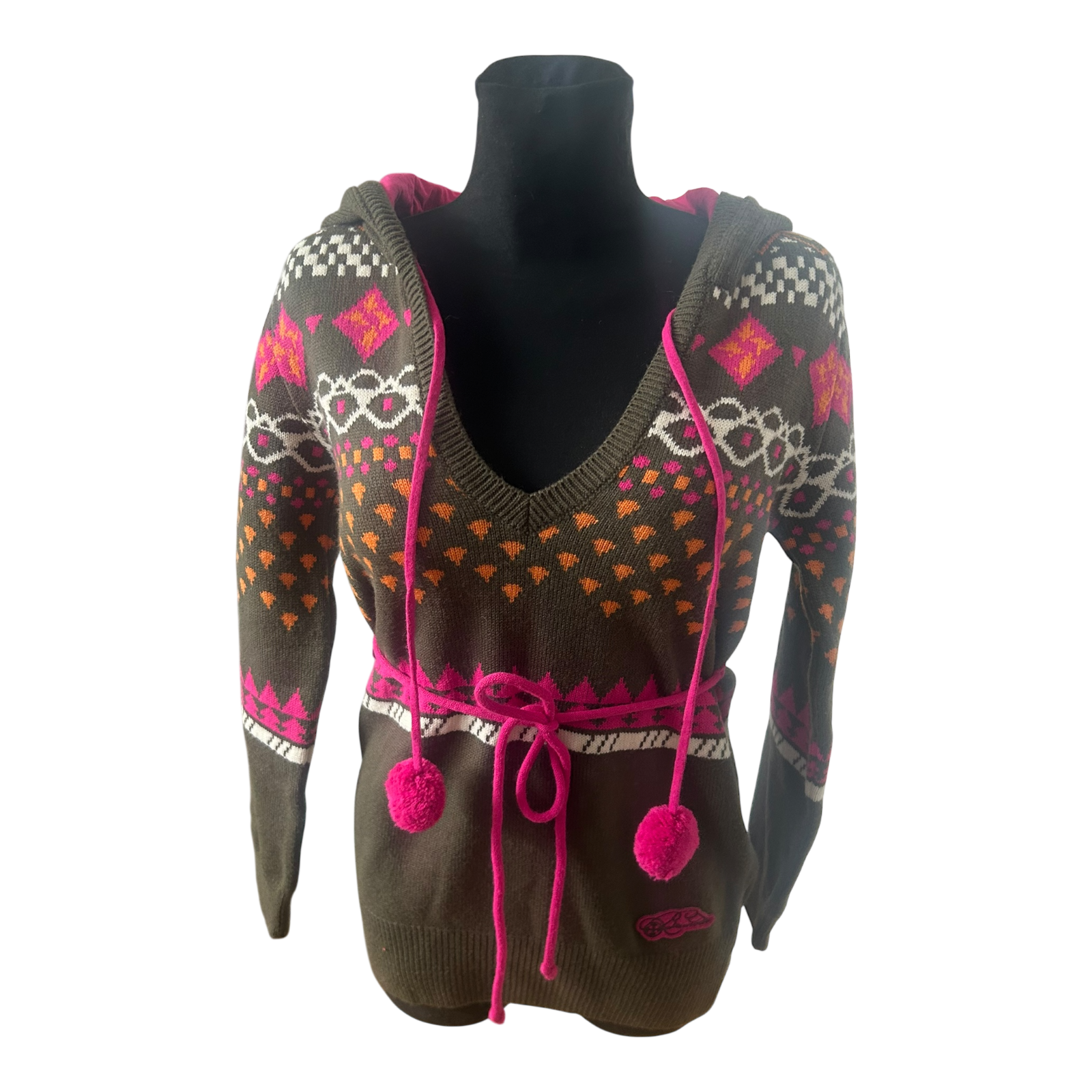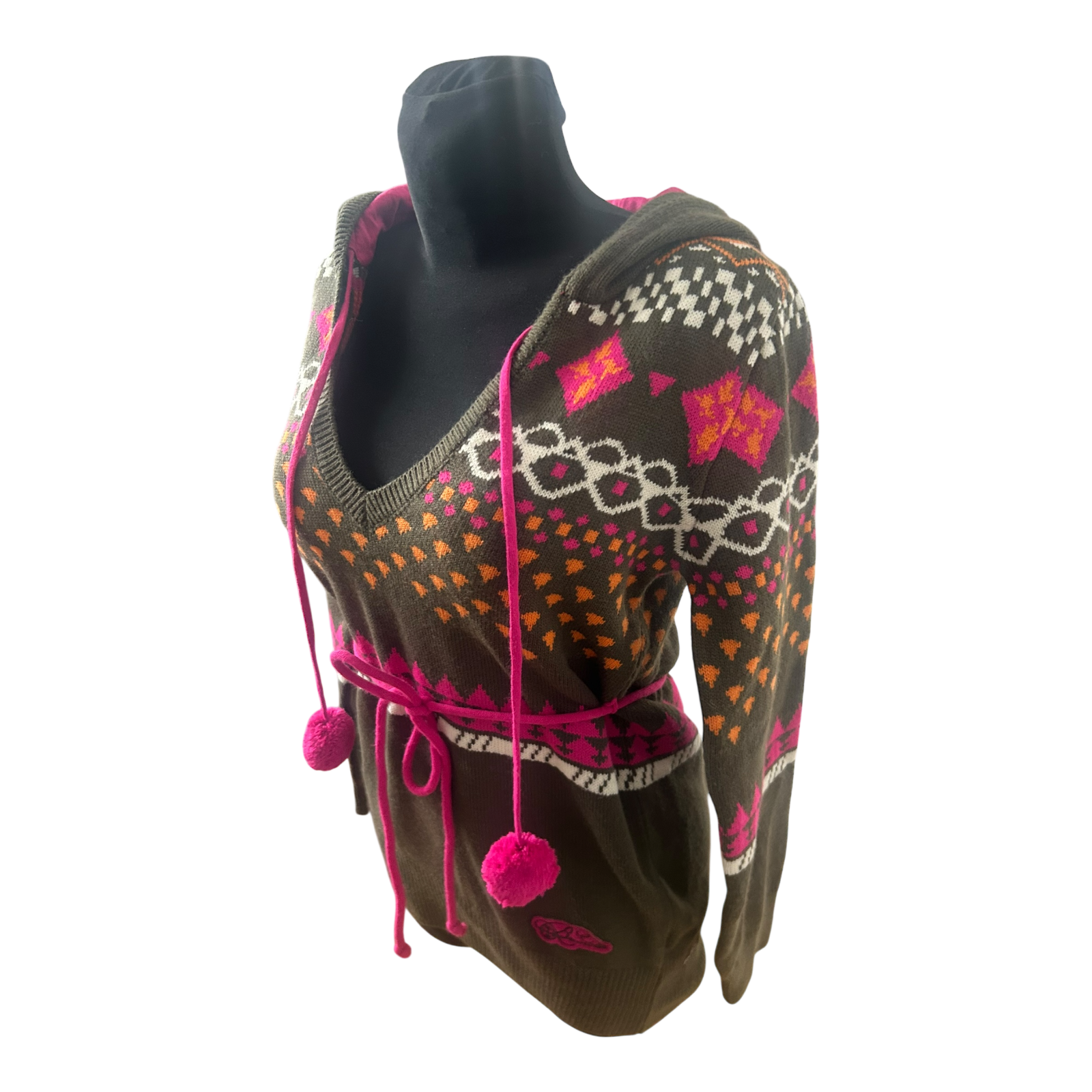 Dieser Damen-Strickpullover überzeugt durch sein auffälliges Muster in Khaki, Pink und Orange sowie durch die besondere Schnittführung mit Kapuze und Bindegürtel. Die dekorativen Kordeln mit Pompons setzen einen verspielten Akzent und unterstreichen den individuellen Look.