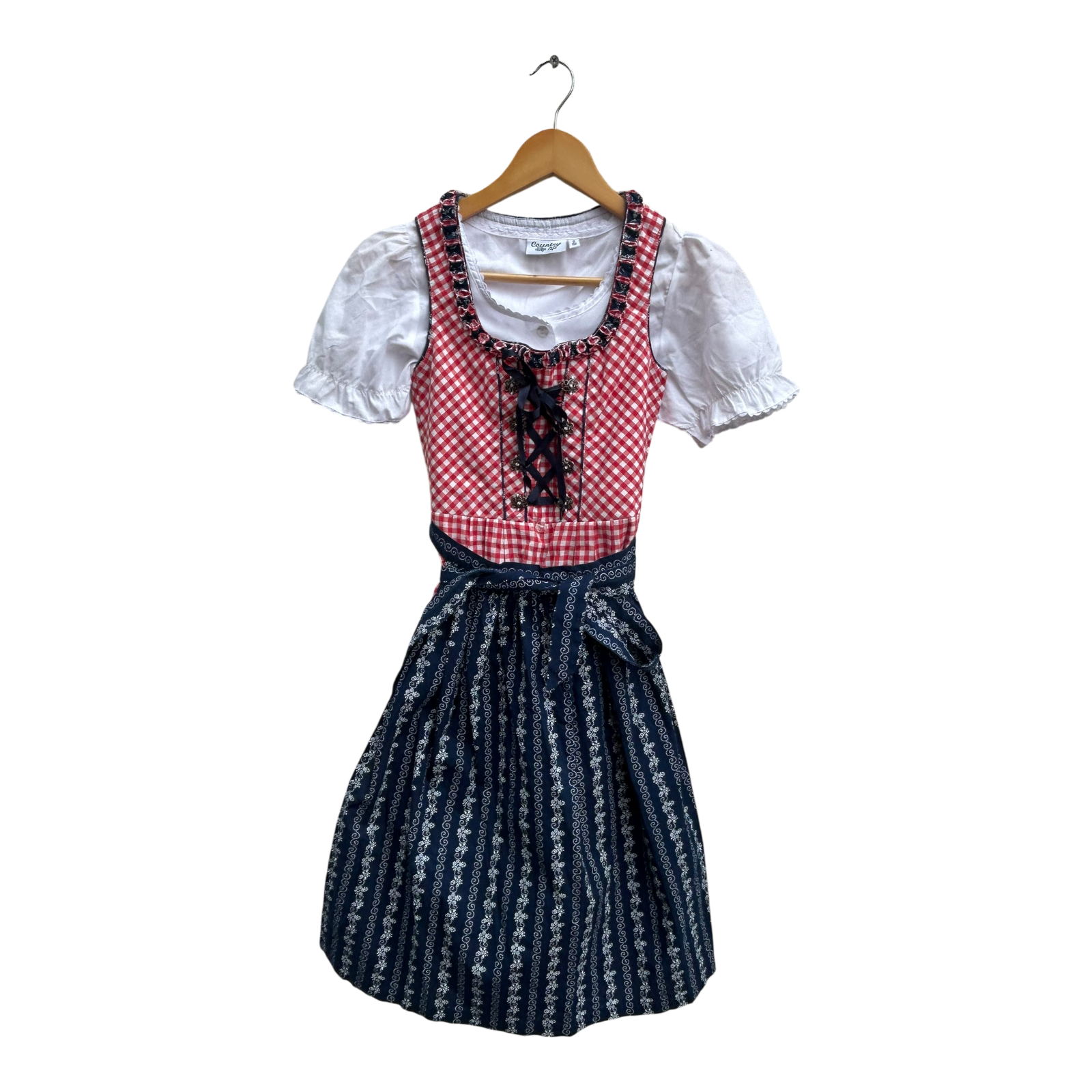 - Besonderheiten: Dreiteiliges Set, Klassische Schnürung, Puffärmel, Reißverschluss, Traditionelles Trachtenmuster