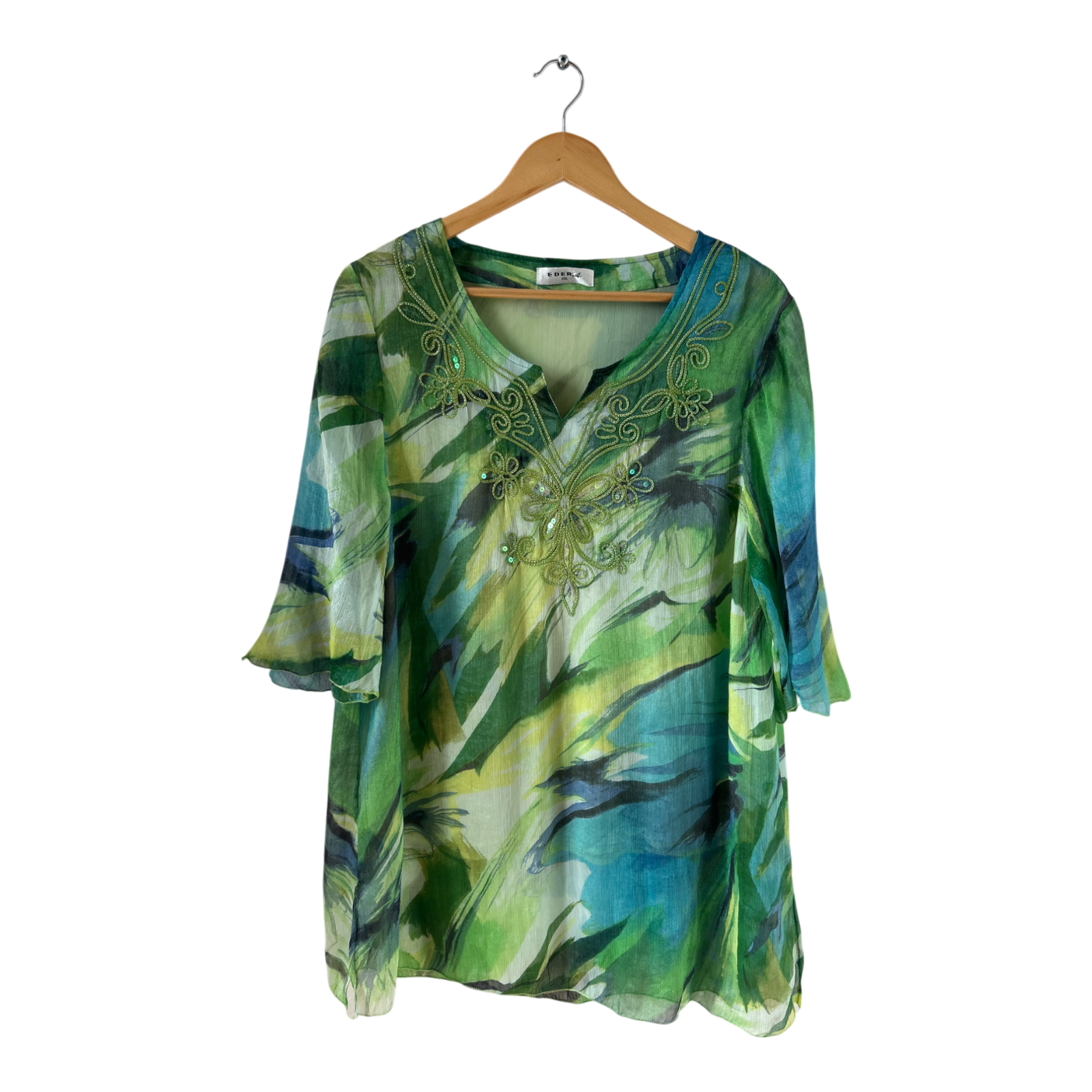 Farbenfroh und edel zugleich – diese Tunika von Eder in Größe XXL überzeugt mit hochwertigem Materialmix und aufwendiger Stickerei am Ausschnitt ✨. Der fließende Stoff mit Seidenanteil ist angenehm gefüttert und macht das Tragegefühl besonders komfortabel. Seitenschlitze sorgen für Bewegungsfreiheit, der florale Print in Blau und Grün unterstreicht den sommerlich-exotischen Look. Ideal für Freizeit, Urlaub oder besondere Anlässe.