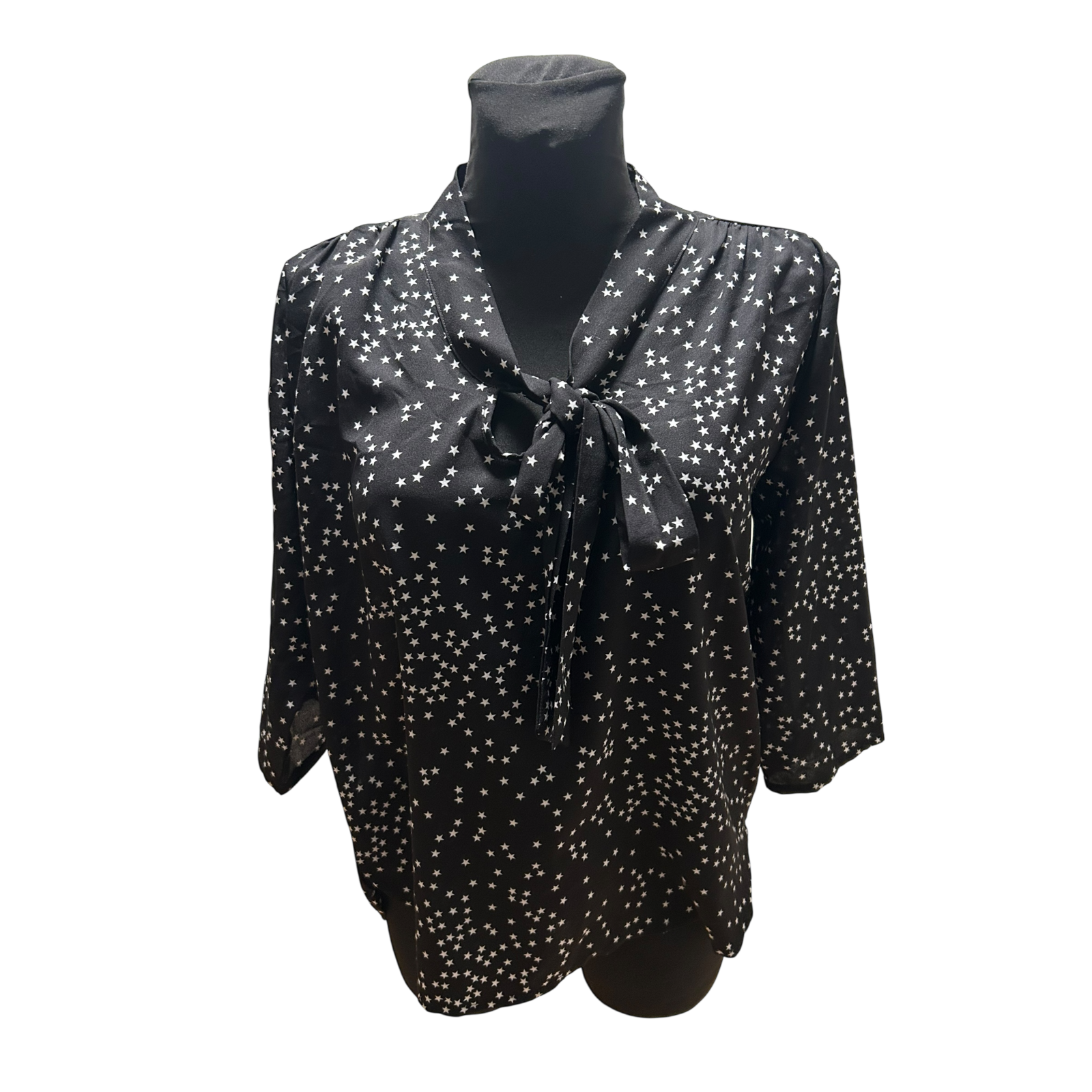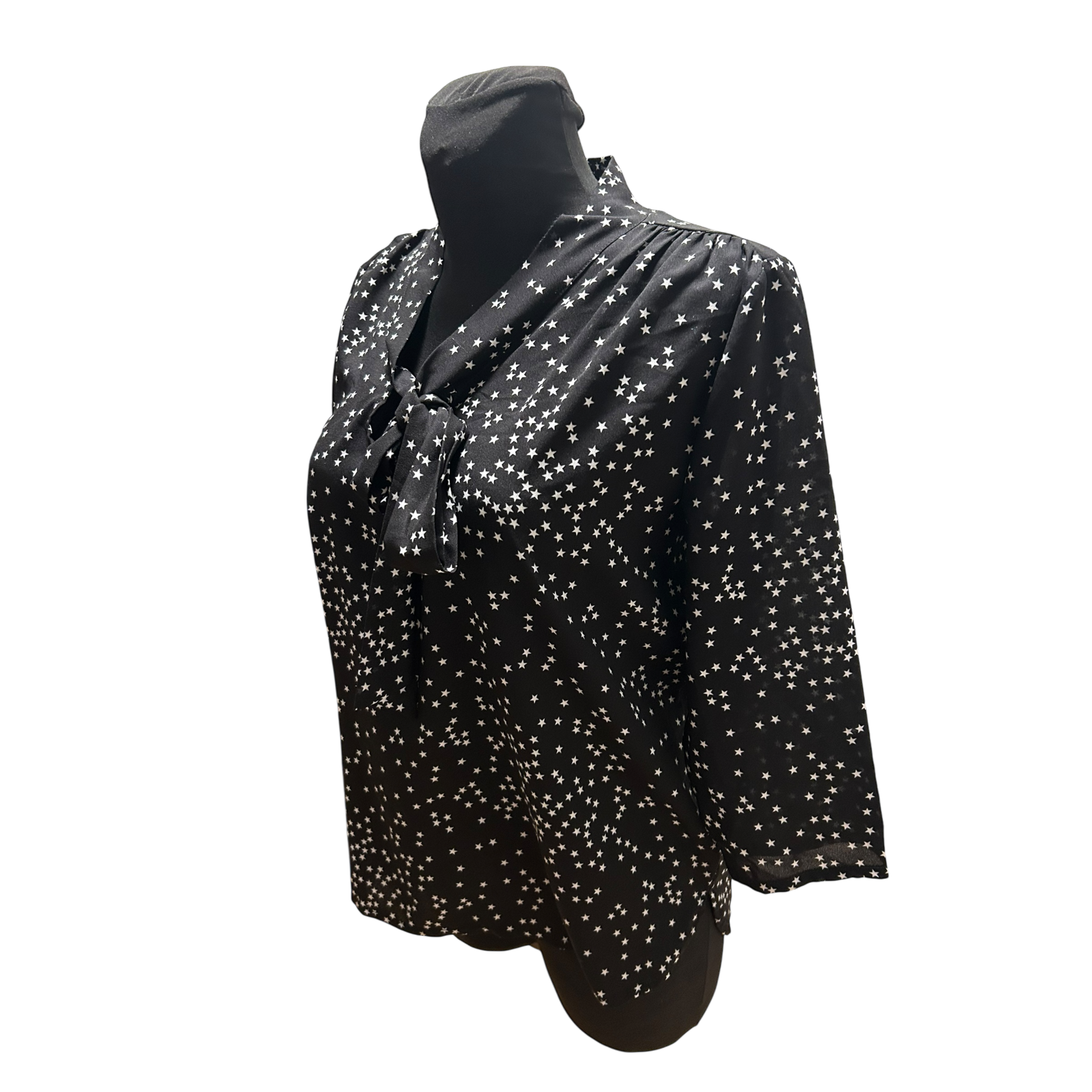 Diese wunderschöne Bluse von Eiki Italia in Größe M überzeugt mit ihrem eleganten Sternenmuster auf schwarzem Grund und einer femininen Schleife am Ausschnitt ✨ Das Material besteht aus 100% Polyester und fällt angenehm leicht und fließend. Die Bluse wirkt edel und ist gleichzeitig wunderbar tragbar – perfekt für Büro, Abendessen oder besondere Anlässe.