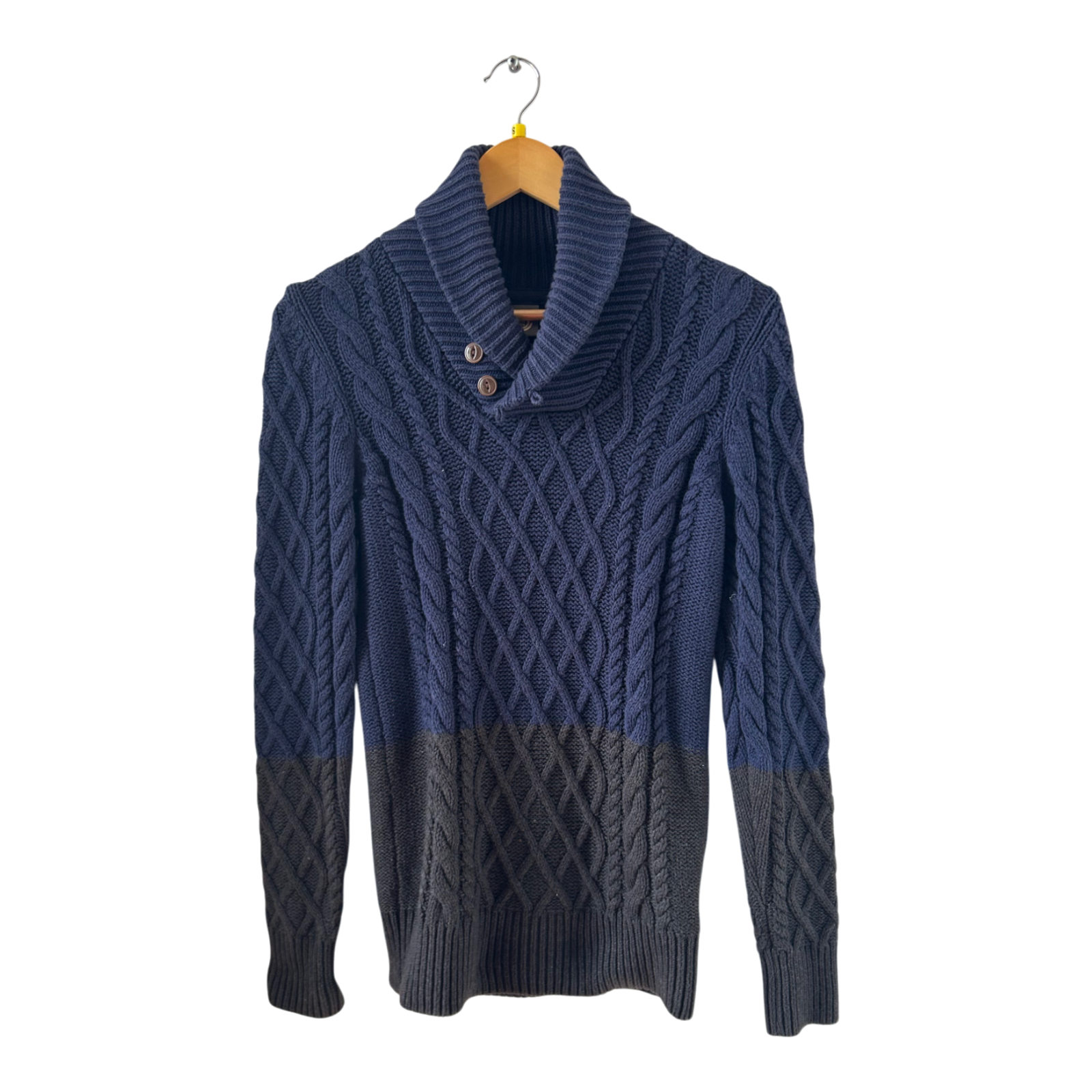 - Besonderheiten: Schalkragen mit Knöpfen, Zweifarbig, Zopfmuster