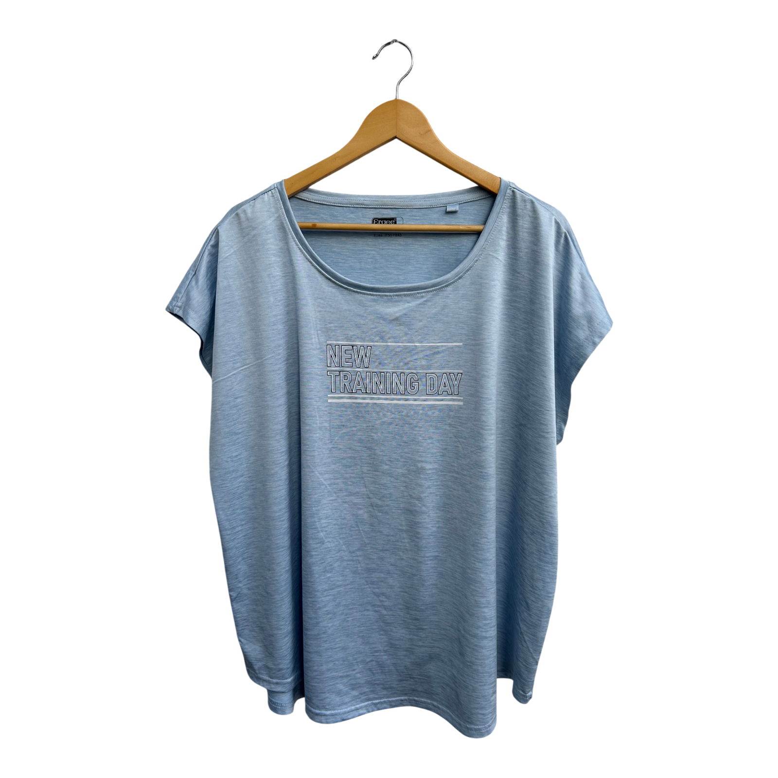 Sportliches Shirt von Ergee in Größe 46. Das hellblaue Oberteil mit dem Aufdruck „New Training Day“ ist aus weichem, elastischem Material gefertigt und bietet hohen Tragekomfort. Der Schnitt fällt locker und schmeichelt der Figur – perfekt für Freizeit, Fitness oder entspannte Tage. Brustweite ca. 64 cm, Länge ca. 67 cm. Sehr guter Zustand. 💙