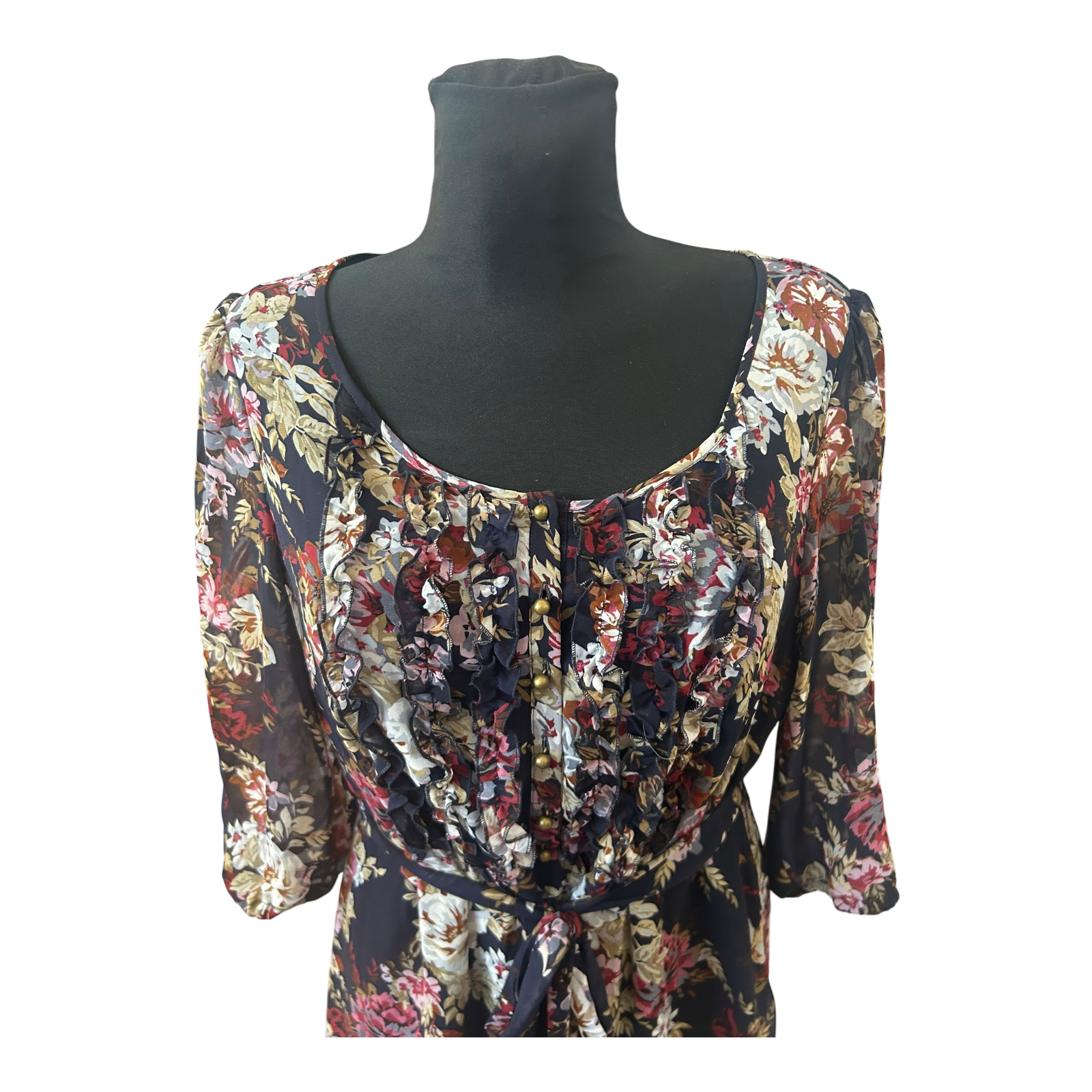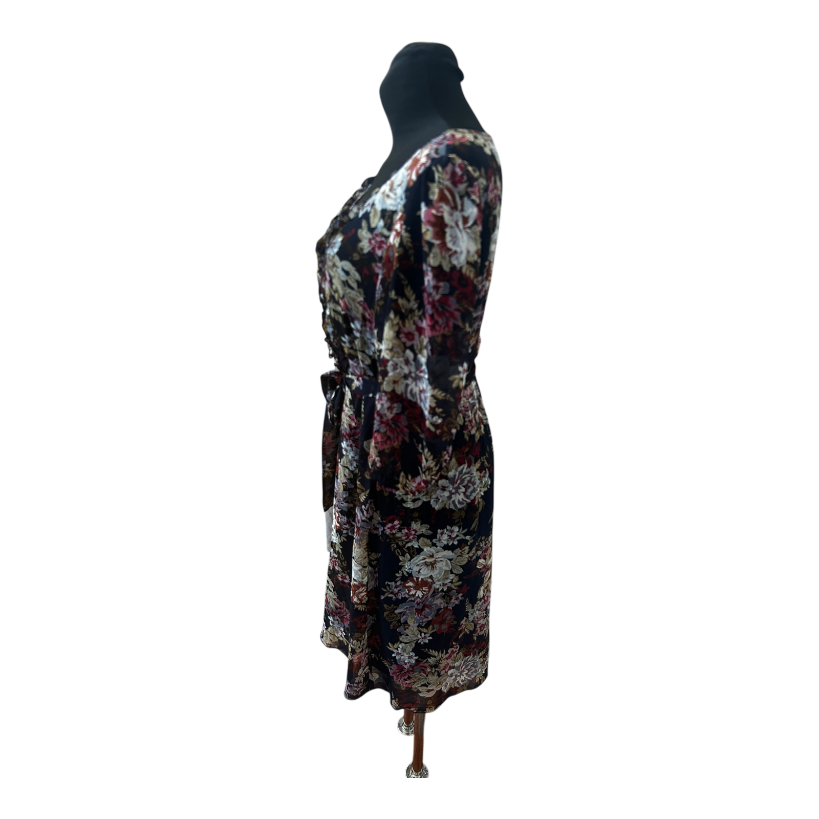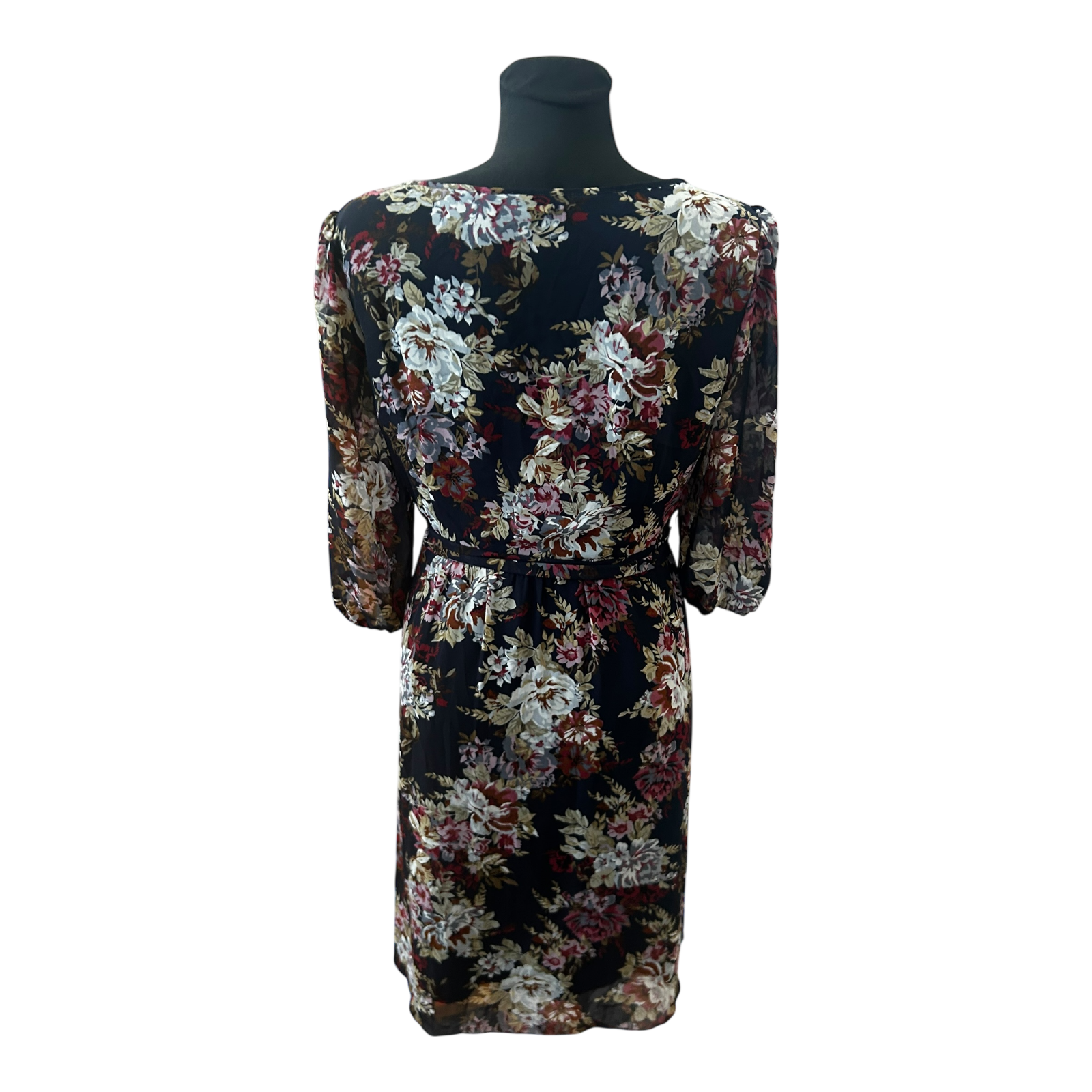 Elegantes Kleid von Esprit Collection in Größe 42 mit floralem Muster auf dunklem Grund. Das Modell ist aus leichtem Chiffon gefertigt und wirkt durch die feine Raffung im Brustbereich sowie den Bindegürtel in der Taille besonders feminin und ausgewogen. Das Kleid ist vollständig gefüttert und trägt sich angenehm zu jeder Jahreszeit. Die 3/4-Ärmel verleihen dem Design eine elegante Leichtigkeit und machen es vielseitig kombinierbar – sowohl für festliche Anlässe als auch für stilvolle Alltagslooks. 🌸✨