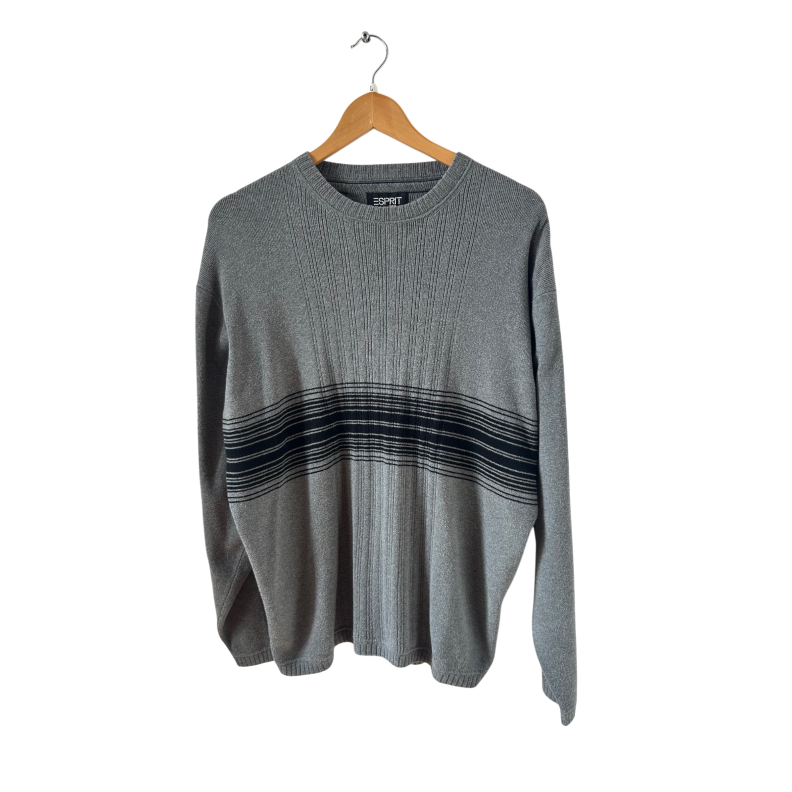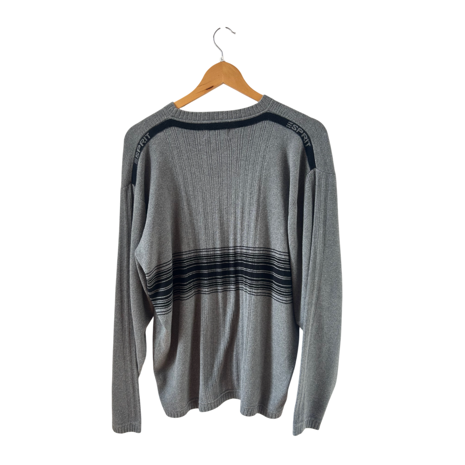 Besonders hervorzuheben ist das feine Strickmuster mit Querstreifen in Schwarz auf Vorder- und Rückseite sowie der Schriftzug "Esprit" an den Schultern. Mit einer Brustweite von ca. 62 cm, einer Länge von ca. 66 cm und einer Ärmellänge von ca. 60 cm bietet er eine lockere und bequeme Passform. Perfekt für Freizeit, Alltag oder lässige Retro-Outfits. 👕✨