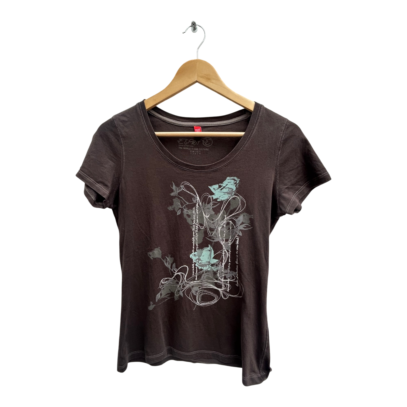 Schönes T-Shirt von Esprit in Größe S aus 100 % Baumwolle. Die Brustweite beträgt 42 cm, die Länge 62 cm. Das Shirt ist in einem dunklen Braunton gehalten und hat auf der Vorderseite einen dezenten floralen Print in Mint- und Grautönen. Der weiche Baumwolljersey sorgt für angenehmen Tragekomfort. Ein vielseitiges Basic mit modischem Akzent, das sich ideal zu Jeans oder Shorts kombinieren lässt. 🌿