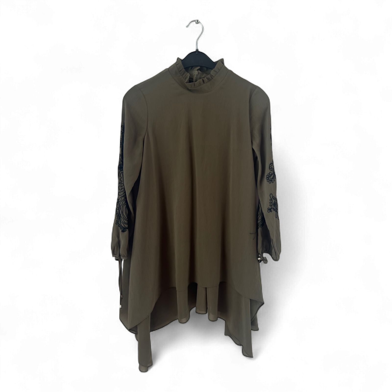 Fließende Tunika von FAMELIN in edlem Khaki, mit lockerem Schnitt und asymmetrischem Saum 🌿. Die schwarze Stickerei an den Ärmeln verleiht einen femininen Boho-Touch ✨. Mit Stehkragen, Reißverschluss hinten und zartem Futter für angenehmen Tragekomfort 💫. Größe 40, Brustweite ca. 52 cm, Länge ca. 90 cm – hervorragender Zustand. Ein stilvoller Begleiter für Alltag & besondere Anlässe 💚