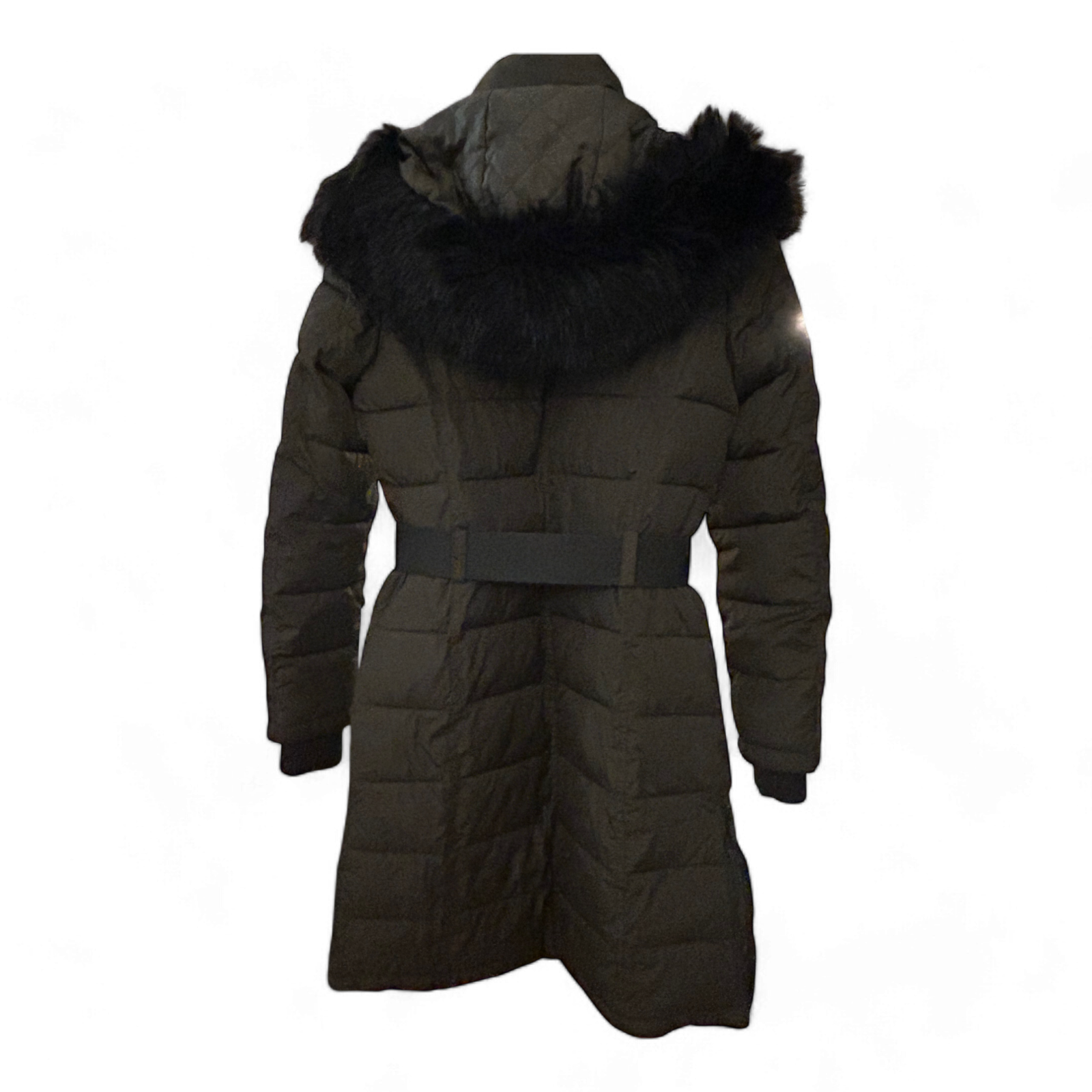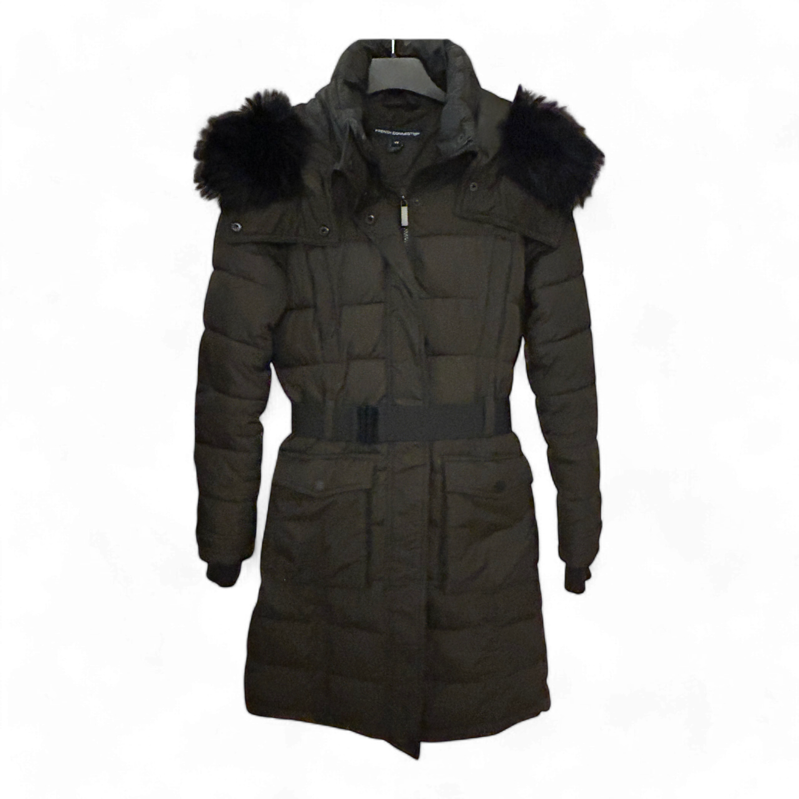 French Connection Damenmantel Gr. XS – Schwarz, tailliert, mit Kunstfellkapuze