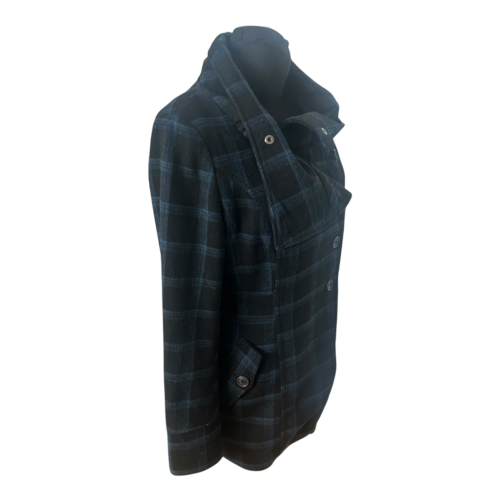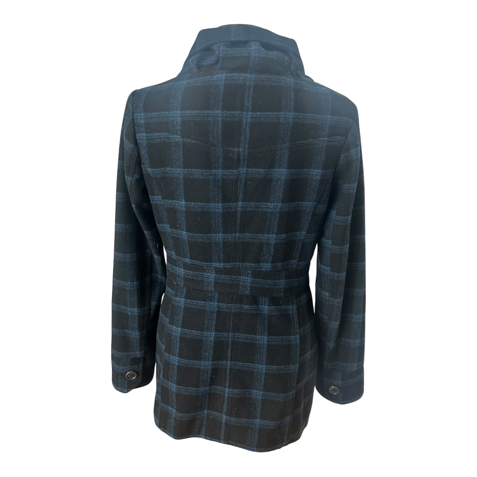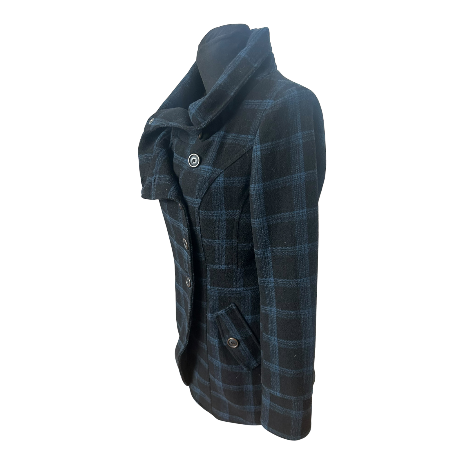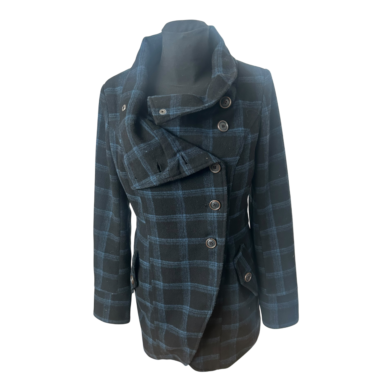 Eleganter Damenmantel von Fresh Made in Größe M mit klassischem Karomuster in Schwarz und Blau. Der Mantel hat einen modernen, leicht asymmetrischen Verschluss mit Knöpfen und einen großen, weich fallenden Kragen, der dem Modell eine besondere und hochwertige Optik verleiht. Die Passform wirkt feminin und gepflegt und eignet sich sowohl für den Alltag als auch für schickere Anlässe.