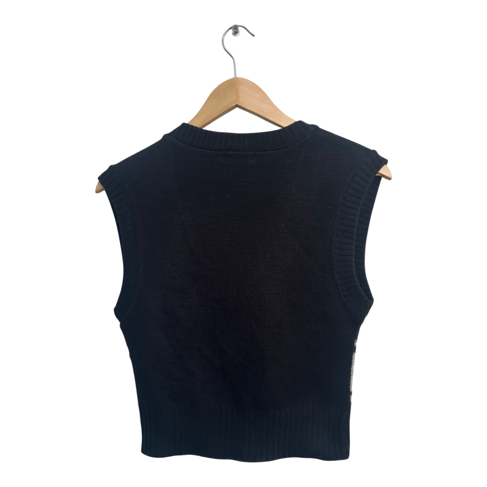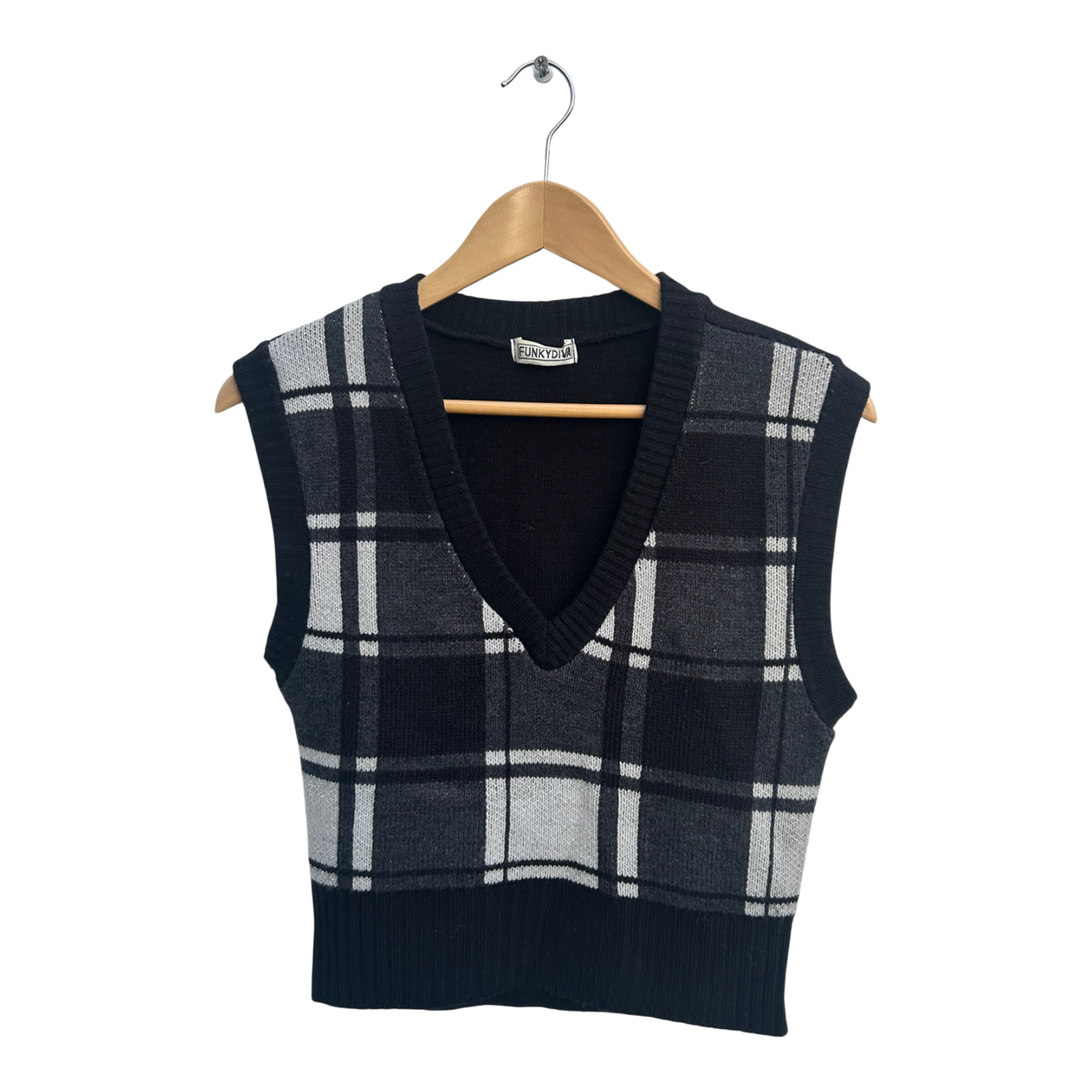 Stylischer Vintage-Pullunder von FUNKYDIVA in Größe M. Das Modell stammt aus den frühen 2000er-Jahren und zeigt den typischen Retro-Look dieser Zeit: markantes Karomuster in Schwarz und Grau, feine Glitzerfäden und ein tief geschnittener V-Ausschnitt.