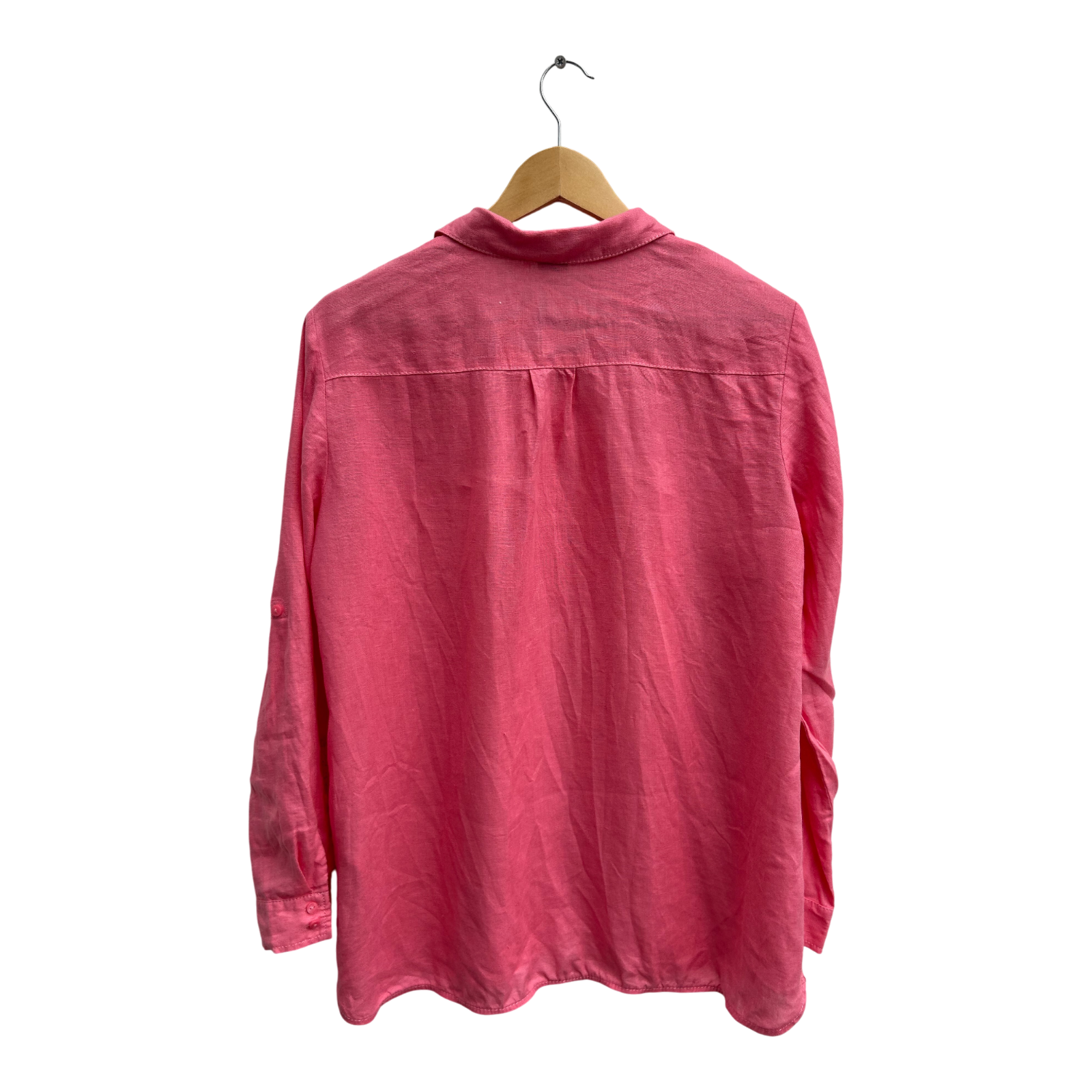 Sommerliche Leinenbluse von Gerry Weber in Größe 40 aus 100 % Leinen. Brustweite 55 cm, Länge 68 cm, Ärmellänge 62 cm. Die Bluse zeigt sich in einem wunderschönen Korallton – frisch, feminin und stilvoll zugleich. Mit zwei Brusttaschen, durchgehender Knopfleiste und praktischen Krempelärmeln lässt sie sich vielseitig tragen – lässig offen über ein Top oder klassisch geschlossen. Das hochwertige Leinen sorgt für ein angenehm kühles Tragegefühl, ideal für warme Tage. Ein edles Basic für Freizeit, Urlaub oder Büro, das immer gepflegt wirkt.