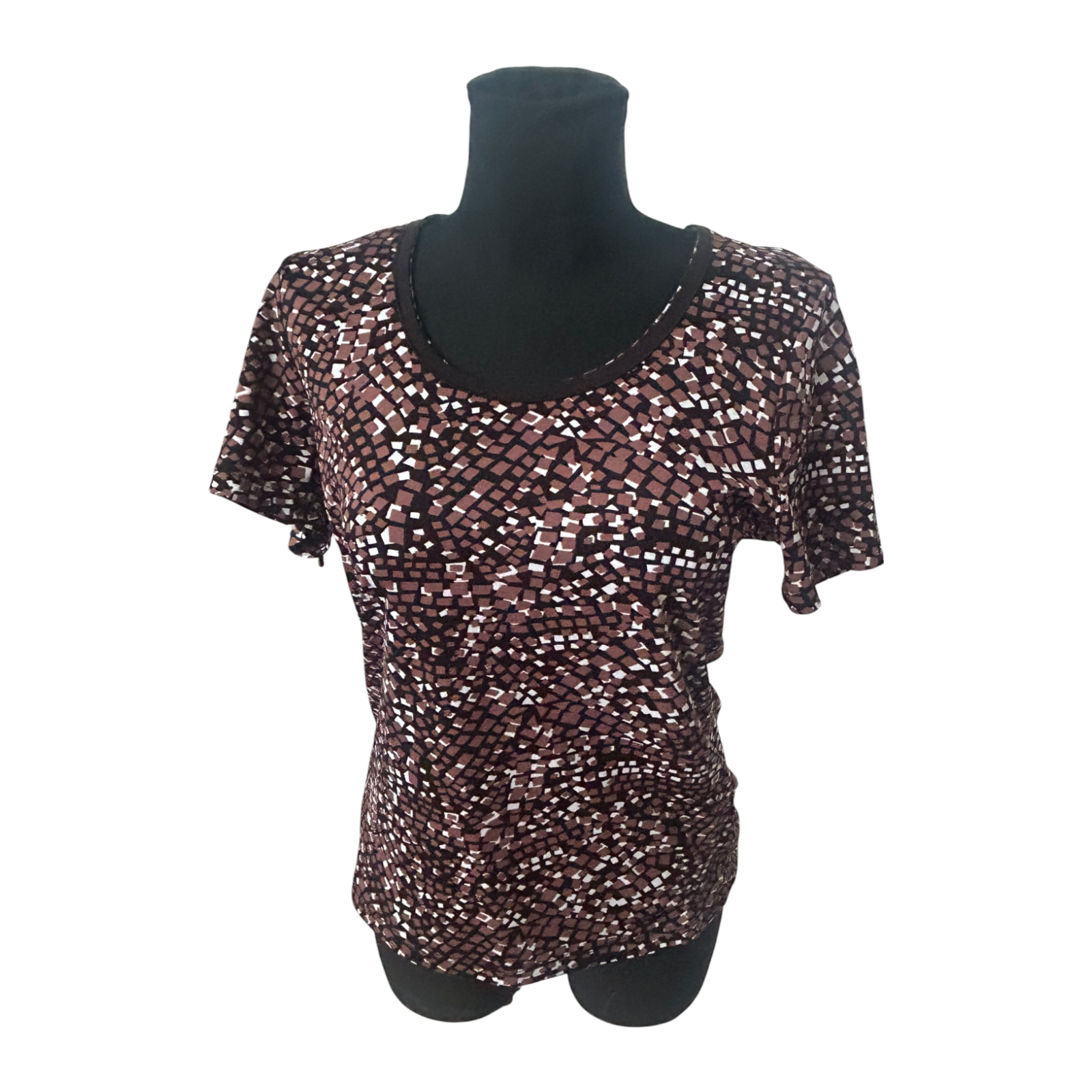 Dieses Shirt von Gina Benotti überzeugt mit einem lebendigen Allover-Muster in warmen Braun- und Naturtönen und einem angenehm leichten Tragegefühl. Der klassische Rundhalsausschnitt und die kurzen Ärmel machen sie zu einem unkomplizierten Begleiter für Alltag und Freizeit 🌿✨